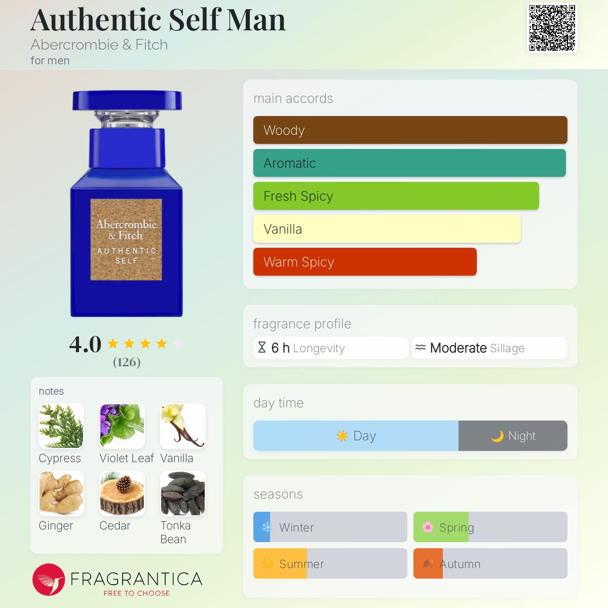 Authentic Self Man by Abercrombie & Fitch is a fragrance for men. This is a new fragrance. Authentic Self Man was launched in 2023. The nose behind this fragrance is Frank Voelkl. Top notes are Cypress, Ginger and Cardamom; middle notes are Violet Leaf, Freesia and Geranium; base notes are Madagascar Vanilla, Virginia Cedar and Tonka Bean. (Fragrantica.com)