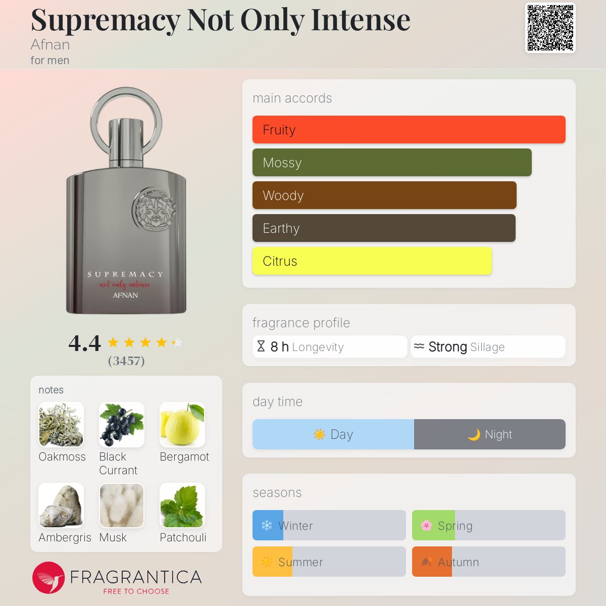 Supremacy Not Only Intense by Afnan is a Oriental Spicy fragrance for men. Supremacy Not Only Intense was launched in 2021. Top notes are Black Currant, Bergamot and Apple; middle notes are Oakmoss, Patchouli and Lavender; base notes are Ambergris, Musk and Saffron. (Fragrantica.com)