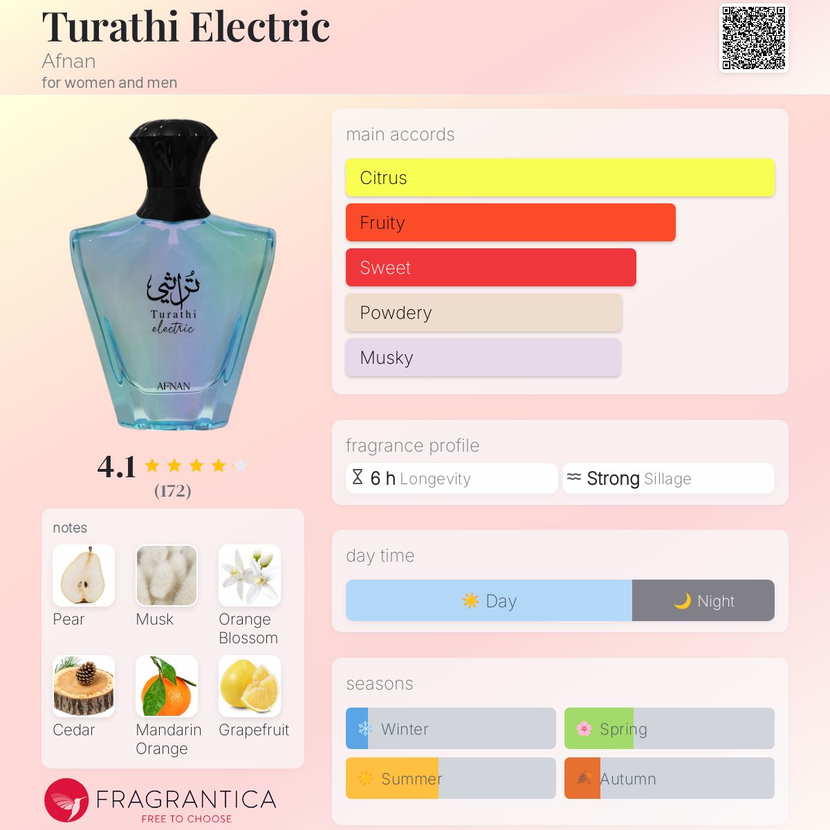 Turathi Electric by Afnan is a Aromatic Fruity fragrance for women and men. This is a new fragrance. Turathi Electric was launched in 2025. Top notes are Pear, Mandarin Orange, Pink Grapefruit and Bergamot; middle notes are Orange Blossom, Cedarwood and Apple; base notes are Musk, Vanilla and Amber. (Fragrantica.com)