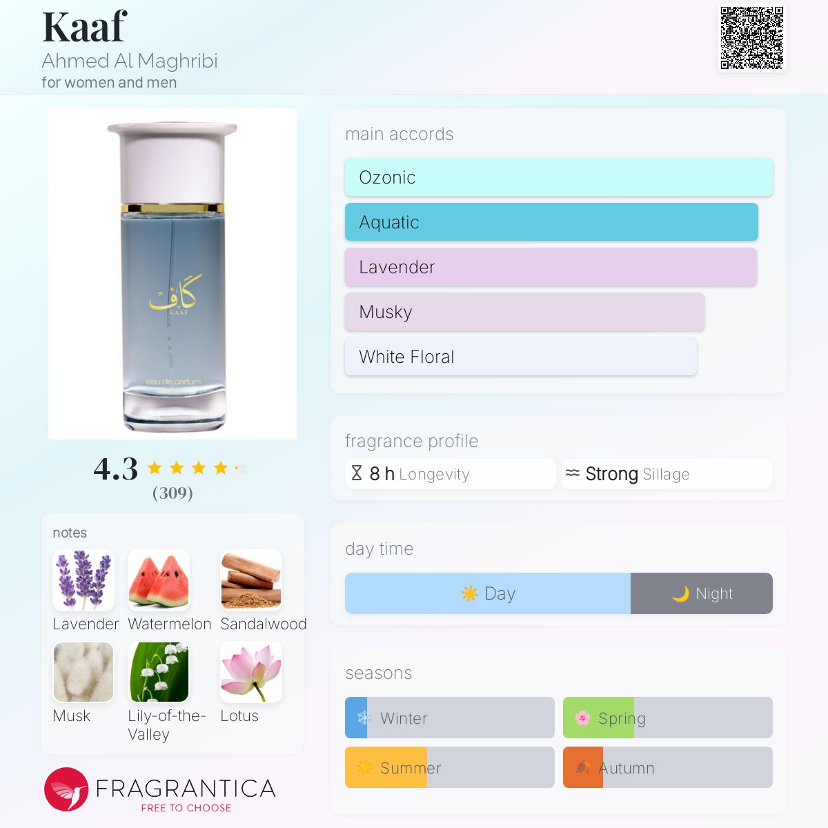Kaaf by Ahmed Al Maghribi is a fragrance for women and men. Kaaf was launched in 2022. Top notes are Lavender, Watermelon, Red Fruits, and Sicilian Orange; middle notes are Lily of the Valley, Lotus, and Jasmine; base notes are Sandalwood, White Musk, and Ambroxan. (Fragrantica.com)