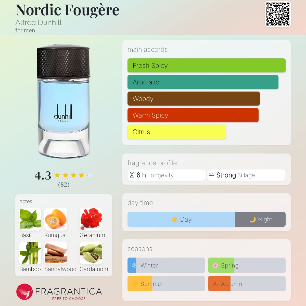 Nordic Fougère by Alfred Dunhill is a Aromatic Fougere fragrance for men. This is a new fragrance. Nordic Fougère was launched in 2022. Nordic Fougère was created by Michel Almairac and Jérôme Epinette. Top notes are Basil, Cardamom and Black Pepper; middle notes are Kumquat, Geranium and Bamboo Leaf; base notes are Sandalwood, Vanilla and Patchouli. (Fragrantica.com)