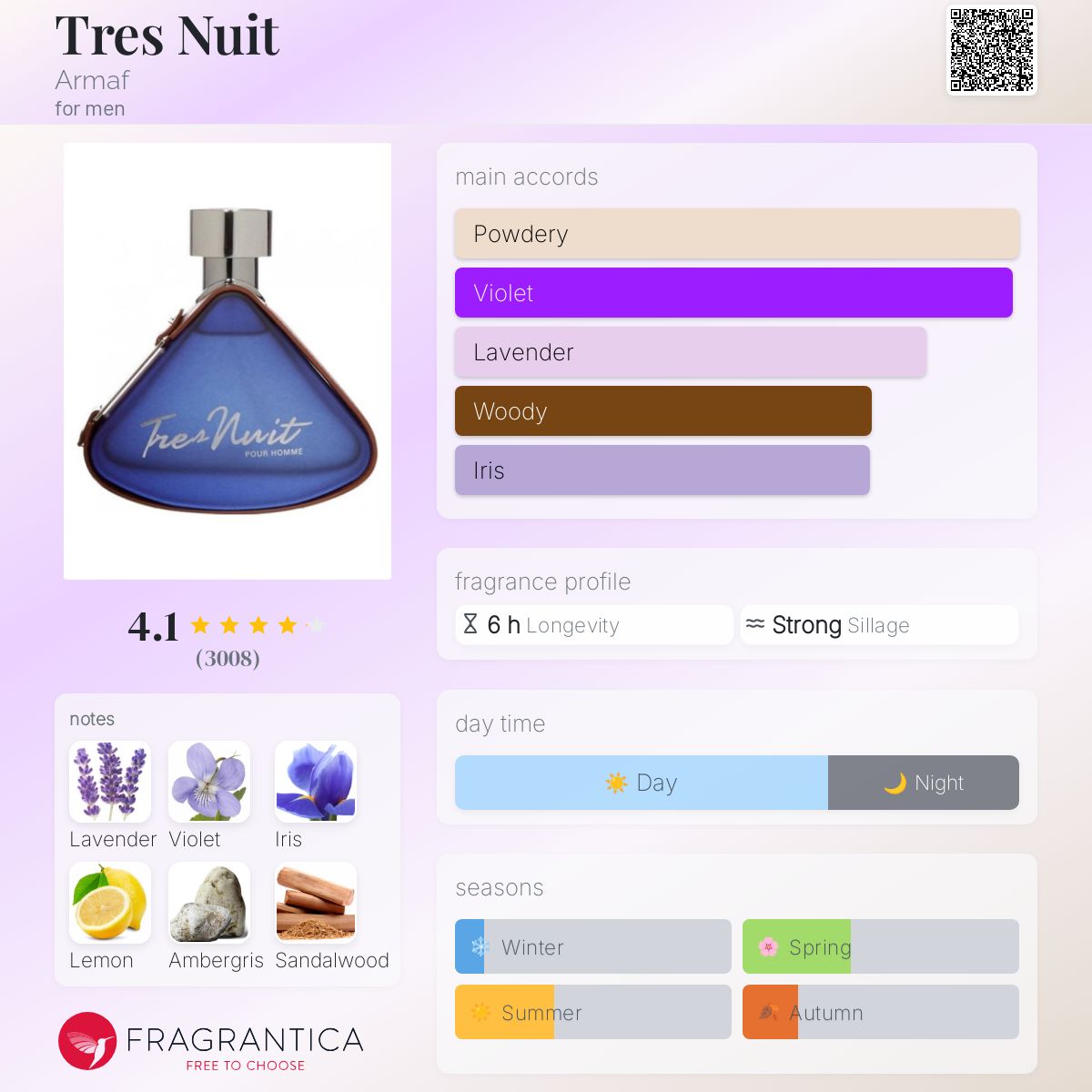 Tres Nuit by Armaf is an Aromatic, Spicy fragrance for men. Top notes are Iris, Lemon, and Vervain; middle notes are Lavender, Violet, and Spicy Notes; base notes are Ambergris and Sandalwood. (Fragrantica.com)