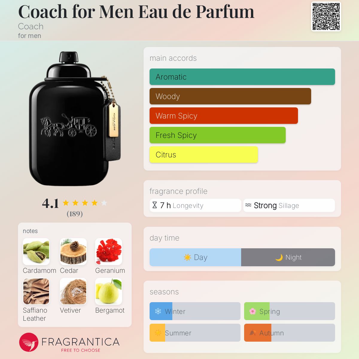 Coach for Men Eau de Parfum by Coach is a Oriental Fougere fragrance for men. This is a new fragrance. Coach for Men Eau de Parfum was launched in 2025. The nose behind this fragrance is Juliette Karagueuzoglou. Top notes are Cardamom and Bergamot; middle notes are Cedarwood and Geranium; base notes are Saffiano Leather and Vetiver. (Fragrantica.com)