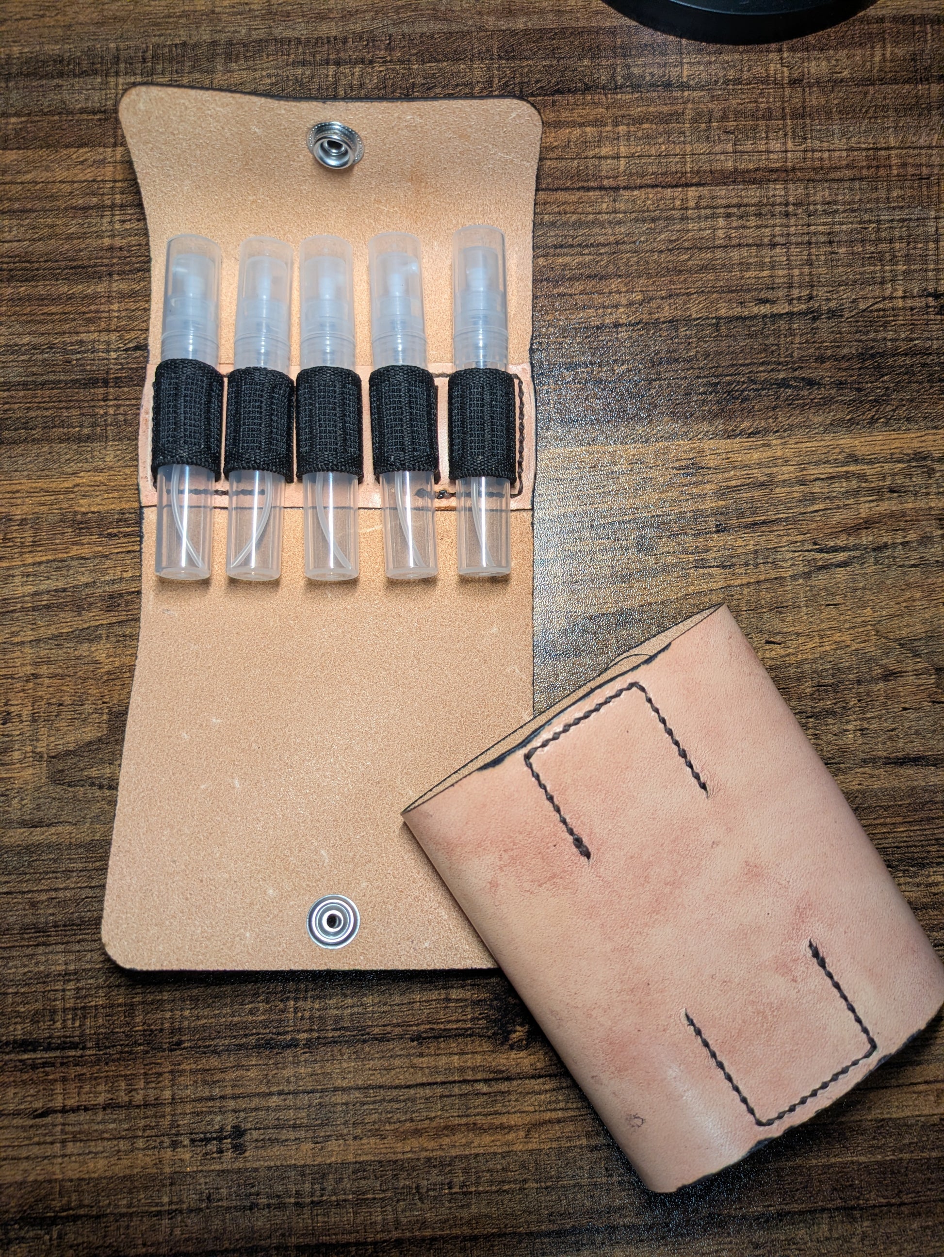 Lux Gentlemen's Society compact leather travel case, holster or carrier to safely transport your travel sprays, decants or samples to work, school or on vacation.