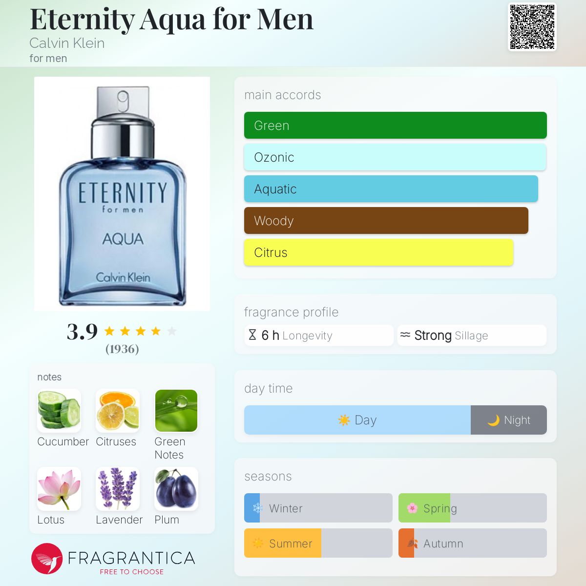 Eternity Aqua for Men by Calvin Klein is a Woody Aromatic fragrance for men. Eternity Aqua for Men was launched in 2010. Top notes are Cucumber, Citruses, Green Notes and Lotus; middle notes are Lavender, Plum, Sichuan Pepper and Virginia Cedar; base notes are Musk, Sandalwood, Patchouli and Guaiac Wood. (Fragrantica.com)