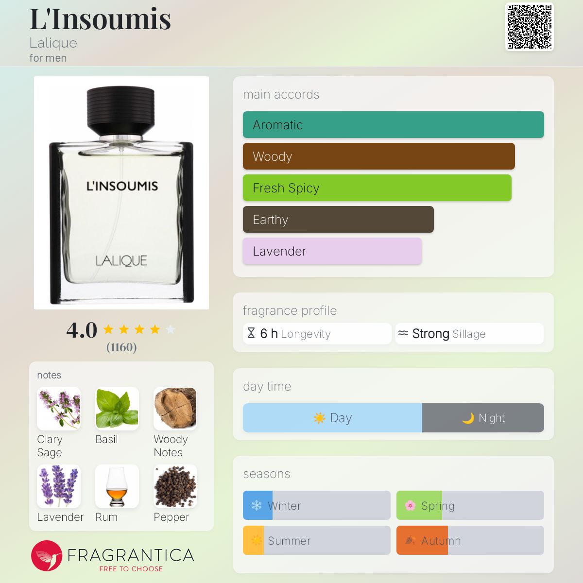 L'Insoumis by Lalique is a Woody Aromatic fragrance for men. L'Insoumis was launched in 2016. The nose behind this fragrance is Fabrice Pellegrin. Top notes are Basil, Rum and Bergamot; middle notes are Clary Sage, Lavender and Black Pepper; base notes are Woody Notes, Haitian Vetiver, Patchouli and Moss. (Fragrantica.com)