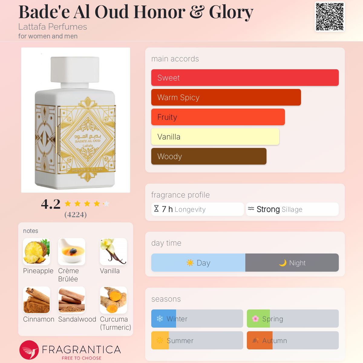 Bade'e Al Oud Honor & Glory by Lattafa Perfumes is a fragrance for women and men. This is a new fragrance. Bade'e Al Oud Honor & Glory was launched in 2023. Top notes are Pineapple and Creme Brulee; middle notes are Cinnamon, Turmeric, Black Pepper and Benzoin; base notes are Vanilla, Sandalwood, Cashmeran and Moss. (Fragrantica.com)