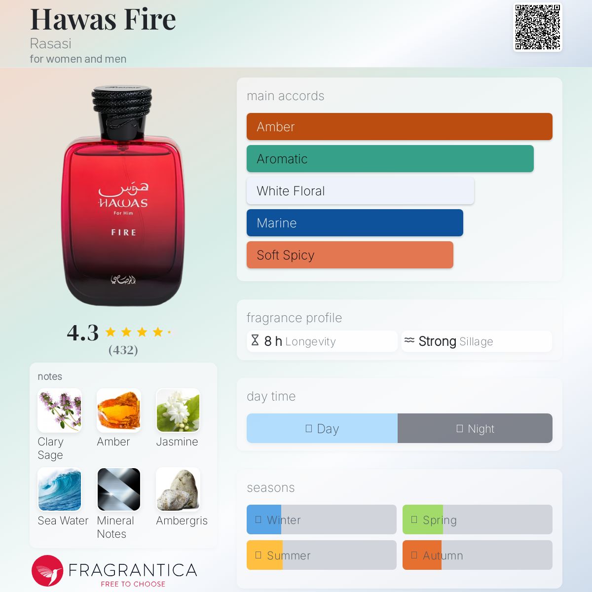 Hawas Fire by Rasasi is a Aromatic Aquatic fragrance for women and men. This is a new fragrance. Hawas Fire was launched in 2025. Top note is Clary Sage; middle notes are Egyptian Jasmine and Marine notes; base notes are Amber, Mineral notes and Ambergris. (Fragrantica.com)