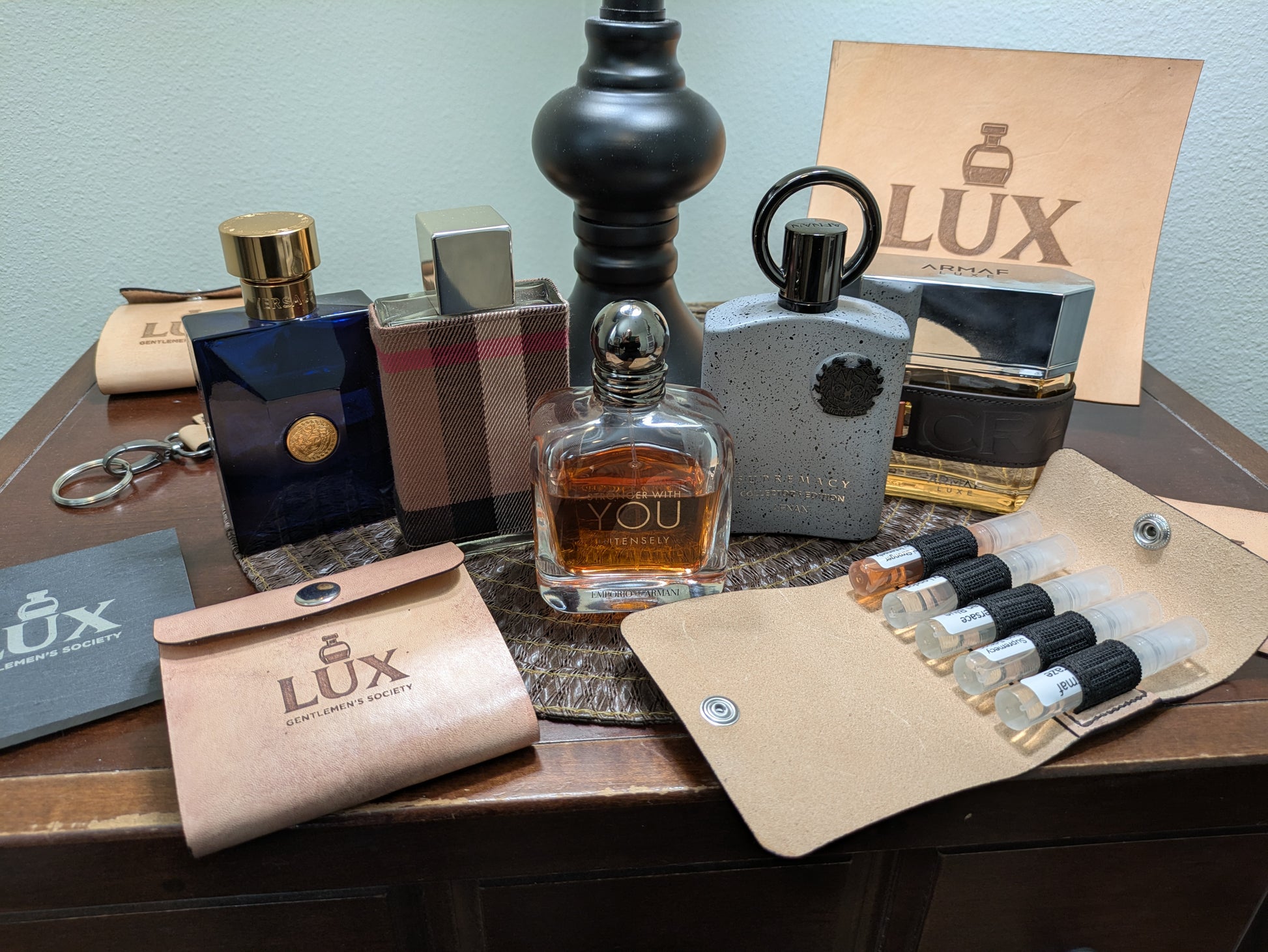 Frag Yap's (YouTube Influencer, content creator and fellow fraghead) 2025 Holiday Travel Spray Gift Set. This set contains Will Hinson's personal favorites for this winter and holiday season. If you need a discovery set or a gift idea, this takes all the guess work out of trying to figure out what works in the colder weather. This set includes a 5ml travel spray of Armani Stronger with You Intensely, Burberry London for Men, Versace Dylan Blue, Afnan Supremacy Collectors Edition, and Armaf Craze. Also included is an official Lux Gentlemen's Society engraved leather travel carrier for your fragrances.