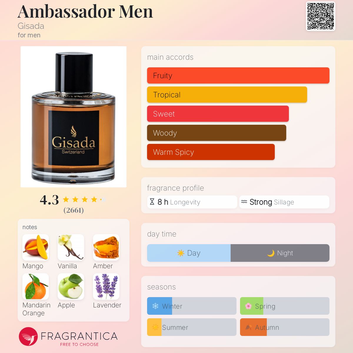 Ambassador Men by Gisada is a Woody Aromatic fragrance for men. Ambassador Men was launched in 2019. The nose behind this fragrance is Andreas Wilhelm. Top notes are Green Mandarin, Apple, Cardamom, and Violet; middle notes are Mango, Lavender, Black Pepper, Patchouli, and Peony; base notes are Vanilla, Amber, Teak Wood, Vetiver, and Moss. (Fragrantica.com)