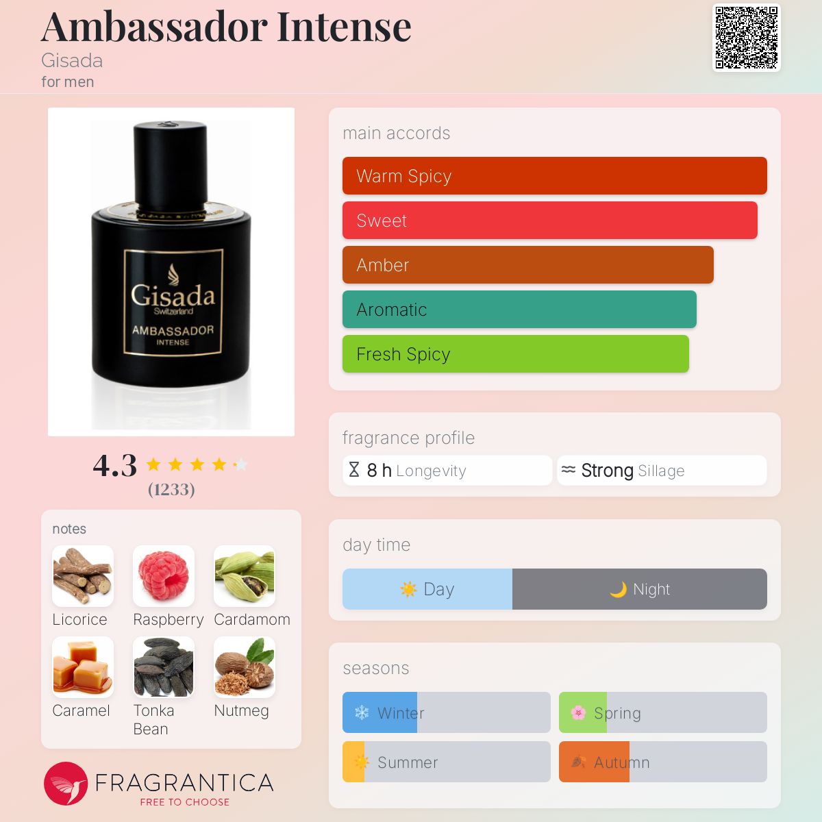 Ambassador Intense by Gisada is a fragrance for men. This is a new fragrance. Ambassador Intense was launched in 2022. The nose behind this fragrance is Olaf Larsen. Top notes are Licorice, Guatemalan Cardamom, Nutmeg, Lavender, Incense, Pink Pepper, elemi, Ginger, Bergamot, Mandarin Orange and Ozonic notes; middle notes are Raspberry, Caramel, Cinnamon, Cloves, Geranium, Jasmine, Orchid, Heliotrope and Freesia; base notes are Tonka Bean, Vanilla, Amber, Patchouli, Cashmere Wood, Leather, Labdanum, Musk, Haitian Vetiver and Oakmoss. (Fragrantica.com)