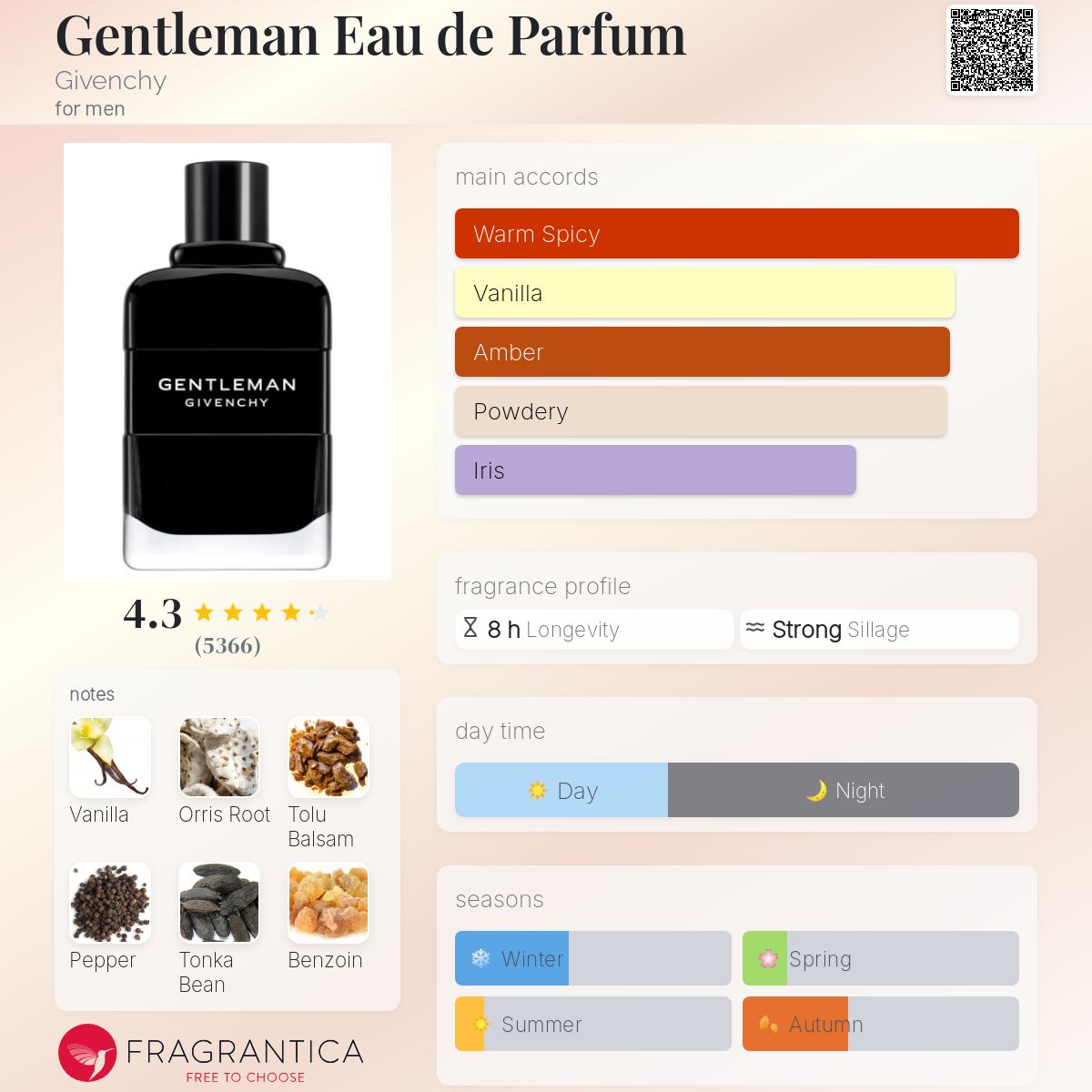 Gentleman Eau de Parfum by Givenchy is a Woody Aromatic fragrance for men. Gentleman Eau de Parfum was launched in 2018. Gentleman Eau de Parfum was created by Olivier Cresp and Nathalie Lorson. Top notes are Black Pepper, Lavender and Bergamot; middle notes are Orris, Cloves and Cinnamon; base notes are Black Vanilla Husk, Tolu Balsam, Tonka Bean, Benzoin and Patchouli. (Fragrantica.com)