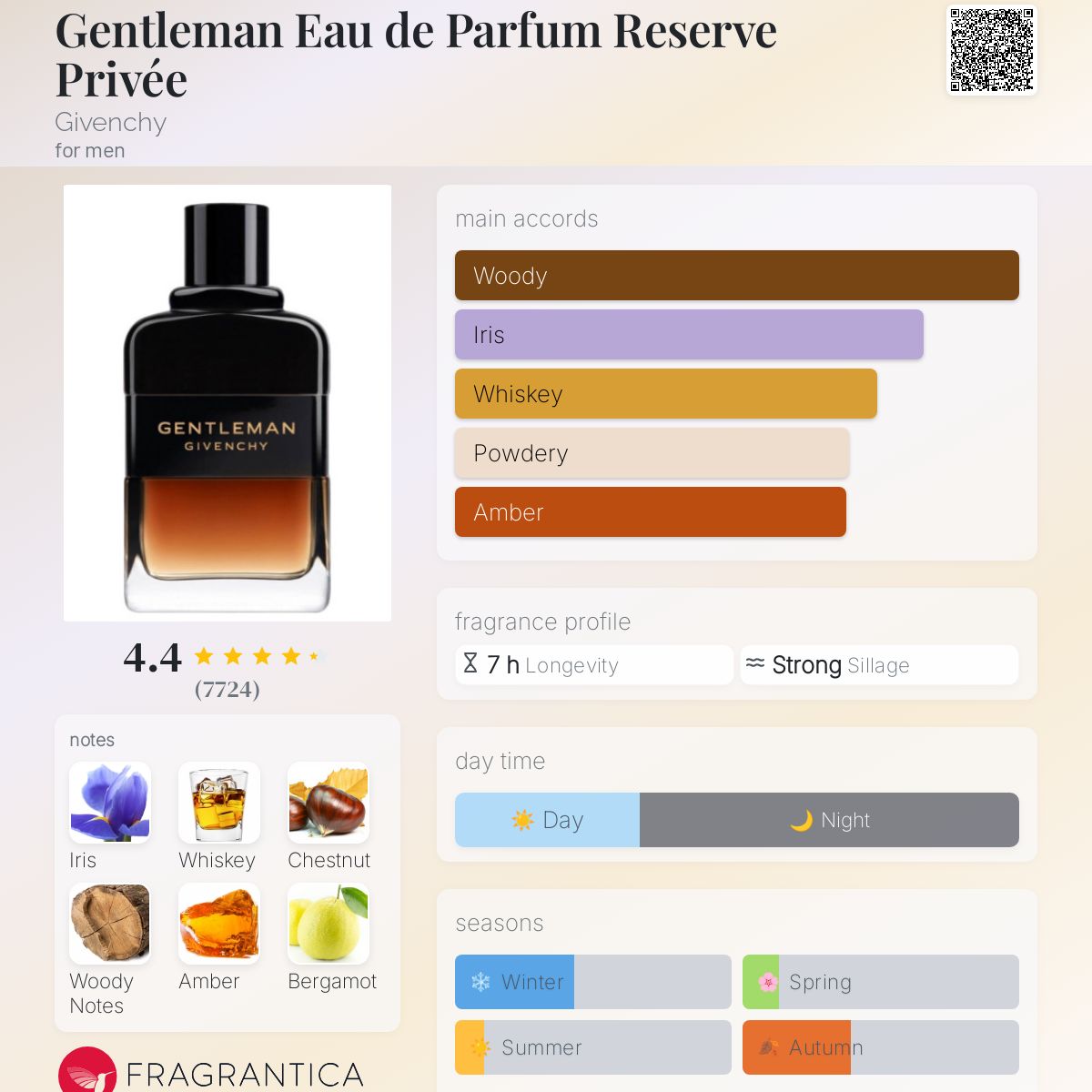 Gentleman Eau de Parfum Reserve Privée by Givenchy is a Oriental Vanilla fragrance for men. This is a new fragrance. Gentleman Eau de Parfum Reserve Privée was launched in 2022. Gentleman Eau de Parfum Reserve Privée was created by Nathalie Lorson and Olivier Cresp. Top note is Bergamot; middle notes are Iris and Chestnut; base notes are Whiskey, Woodsy Notes and Amber. (Fragrantica.com)