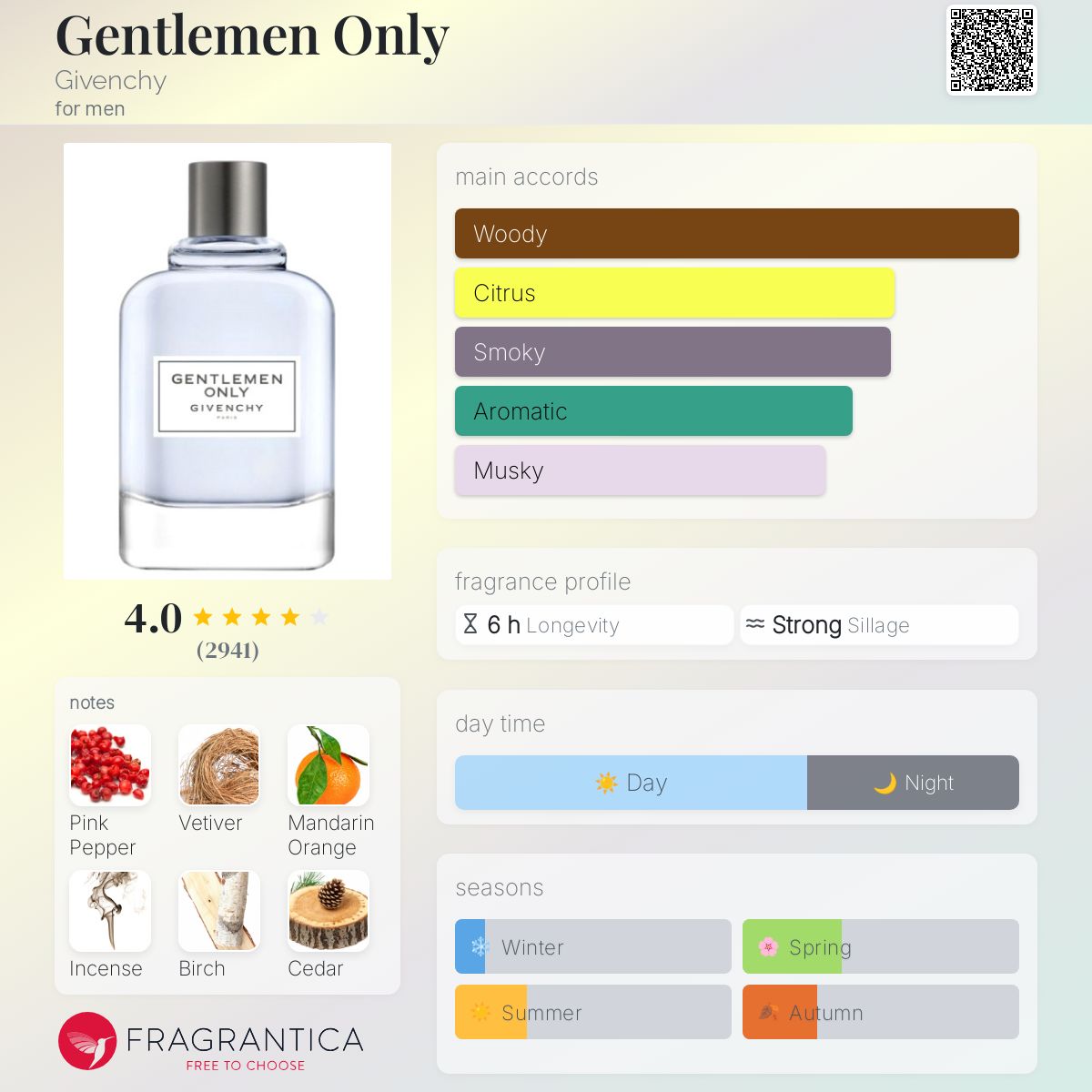 Gentlemen Only by Givenchy is a Woody fragrance for men. Gentlemen Only was launched in 2013. The nose behind this fragrance is Jean Jacques. Top notes are Pink Pepper, Green Mandarin, Birch Leaf, Nutmeg, and Bergamot; middle notes are Vetiver, Cedar, Patchouli, Violet Leaf, and Elemi; base notes are Incense and Musk. (Fragrantica.com)