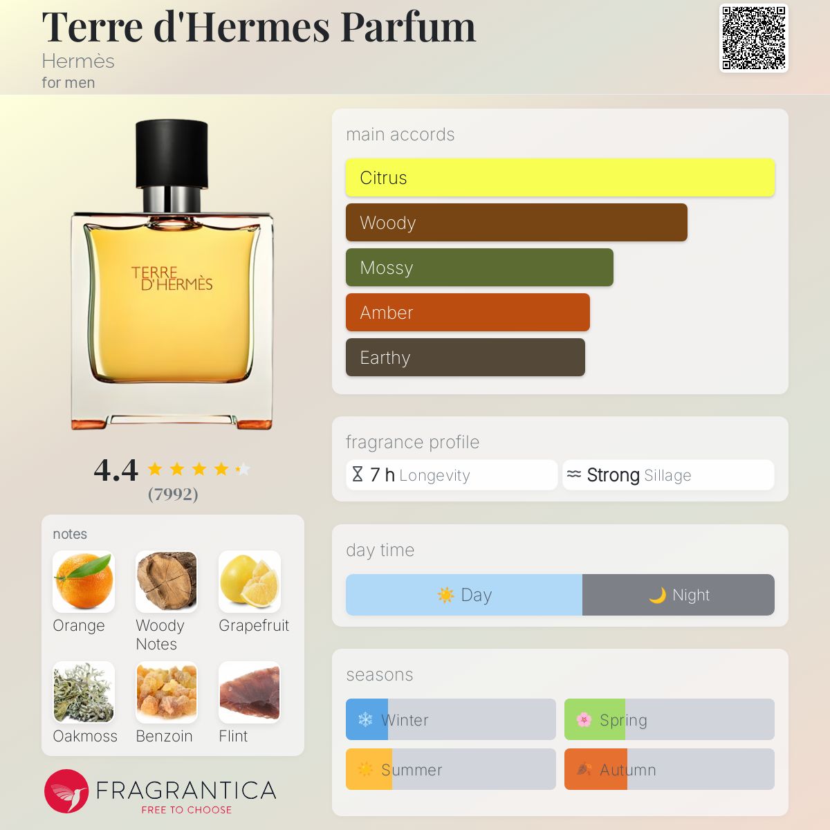 Terre d'Hermes Parfum by Hermès is a Woody Chypre fragrance for men. Terre d'Hermes Parfum was launched in 2009. The nose behind this fragrance is Jean-Claude Ellena. Top notes are Orange and Grapefruit; middle note is Flint; base notes are Woodsy Notes, oak moss and Benzoin. (Fragrantica.com)