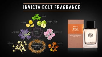 Invicta Bolt is commanding confidence and admiration, a dashing fragrance designed for both sport and leisure. Floral scents of mint leaves combined with citrus notes of lemon zest and green apple add a playful sense of mystery. Oriental tones of vanilla and vetiver are complimented by the warmth of cedar wood. Vibrant and energetic, a complex scent creating an irresistible trail of capability and style. (Invicta.com)
