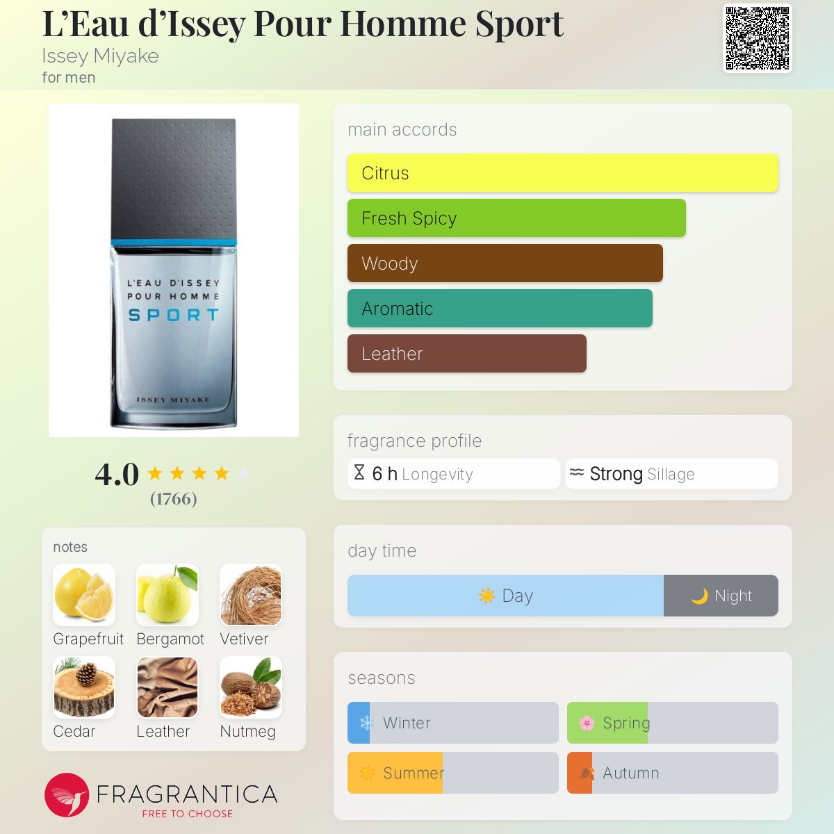 L’Eau d’Issey Pour Homme Sport by Issey Miyake is a Woody Aromatic fragrance for men. L’Eau d’Issey Pour Homme Sport was launched in 2012. The nose behind this fragrance is Jacques Cavallier Belletrud. Top notes are Grapefruit and Bergamot; middle notes are Leather and Nutmeg; base notes are Vetiver, Virginia Cedar, and Ambergris. (Fragrantica.com)