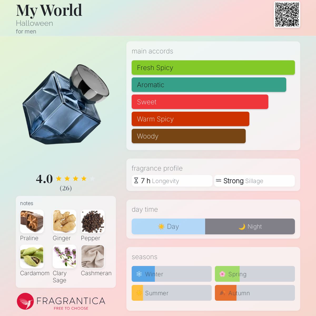 My World by Halloween is a Woody Spicy fragrance for men. This is a new fragrance. My World was launched in 2025. Top notes are Ginger, Cardamom and Bergamot; middle notes are Black Pepper, Clary Sage, juniper berry and Orange Blossom; base notes are Praline, Cashmeran and Vetiver. (Fragrantica.com)
