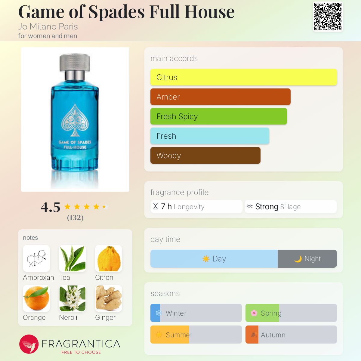 Game of Spades Full House by Jo Milano Paris is a fragrance for women and men. Game of Spades Full House was launched in 2024. Top notes are Citron, Sicilian Orange, and Calabrian bergamot; middle notes are Tunisian Neroli, Nigerian Ginger, and Ceylon Cinnamon; base notes are Chinese Black Tea, Guaiac Wood, Olibanum, and Ambroxan. (Fragrantica.com)