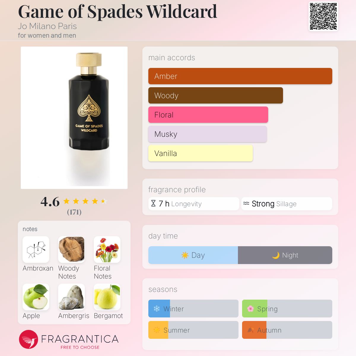 Game of Spades Wildcard by Jo Milano Paris is a Floral Woody Musk fragrance for women and men. Game of Spades Wildcard was launched in 2022. Top notes are Bergamot, Flowers, and Coriander; middle notes are Ambroxan, Apple, and Vanilla; base notes are Woodsy Notes, Tonka Bean, and Ambergris. (Fragrantica.com)