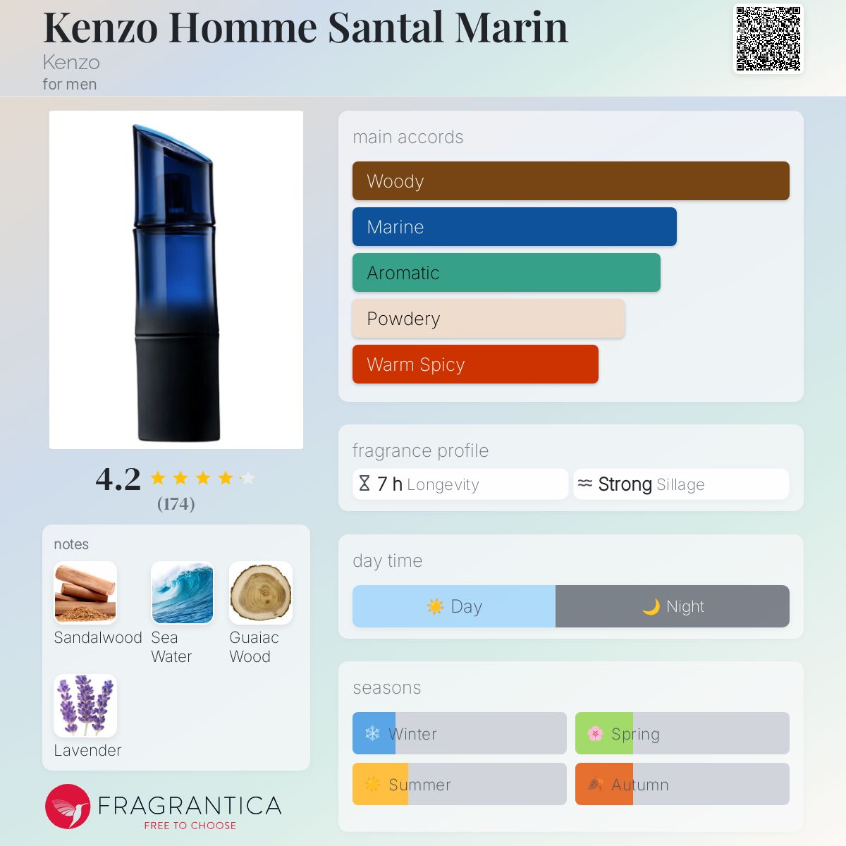Kenzo Homme Santal Marin by Kenzo is a Woody Aquatic fragrance for men. This is a new fragrance. Kenzo Homme Santal Marin was launched in 2024. The nose behind this fragrance is Quentin Bisch. Top note is Sea Notes; middle note is Lavender; base notes are Sandalwood and Guaiac Wood. (Fragrantica.com)