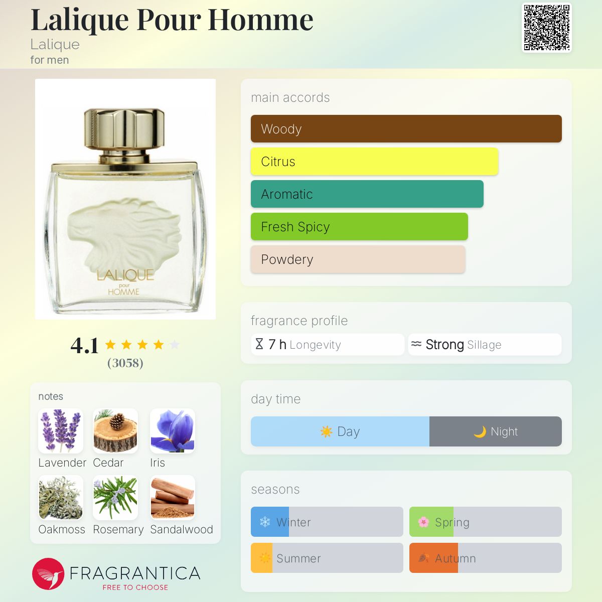 Lalique Pour Homme by Lalique is a Woody Aromatic fragrance for men. Lalique Pour Homme was launched in 1997. The nose behind this fragrance is Maurice Roucel. Top notes are Lavender, Rosemary, Bergamot, Grapefruit, Pomelo, Mandarin Orange, and Tangerine; middle notes are Cedar, Iris, Lily-of-the-Valley, and Jasmine; base notes are Oakmoss, Sandalwood, Vanilla, Patchouli, and Amber. (Fragrantica.com)