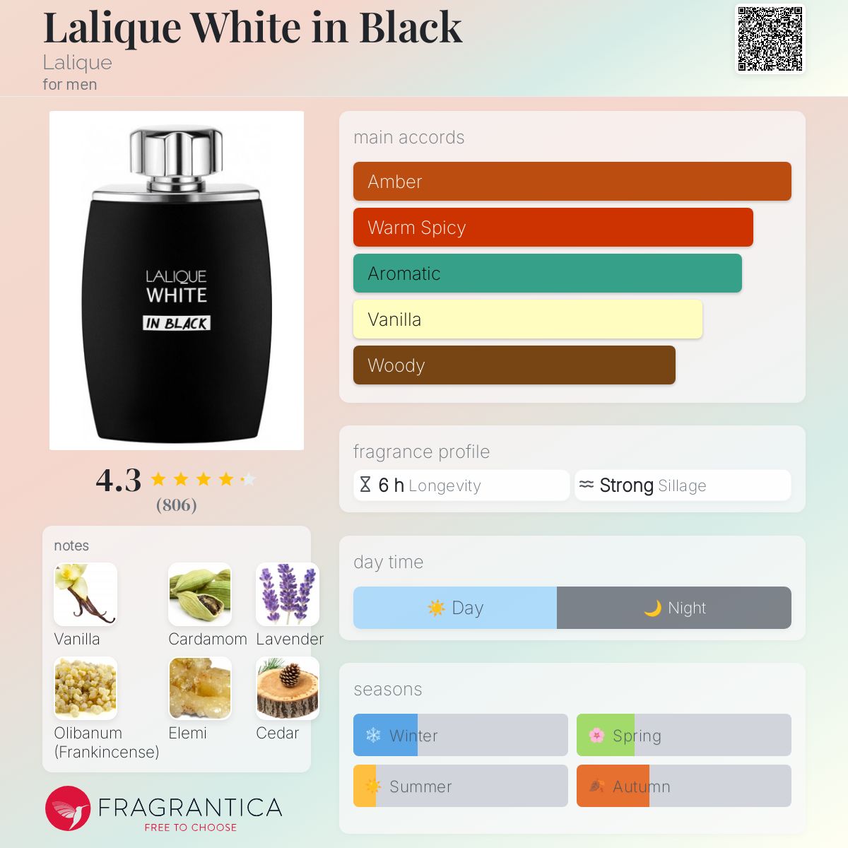 Lalique White in Black by Lalique is an Aromatic, Spicy fragrance for men. Lalique White in Black was launched in 2021. The nose behind this fragrance is Karine Dubreuil-Sereni. Top notes are Olibanum, Sicilian Bergamot, and Grapefruit; middle notes are Cardamom, Lavender Extract, Elemi resin, and Pink Pepper; base notes are Vanilla, White Cedar Extract, Tolu Balsam, Ambroxan, and Patchouli. (Fragrantica.com)