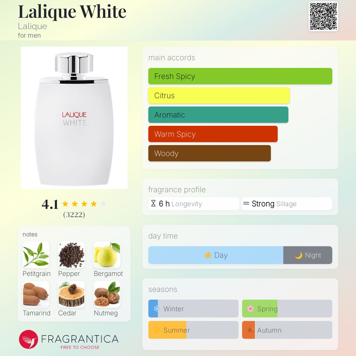 Lalique White by Lalique is a Citrus Aromatic fragrance for men. Lalique White was launched in 2008. The nose behind this fragrance is Christine Nagel. Top notes are Lemon Leaf, Bergamot, Tamarind, and Elemi; middle notes are White Pepper, Nutmeg, Cardamom, and Violet; base notes are Cedar, Musk, Oakmoss, and Amber. (Fragrantica.com)
