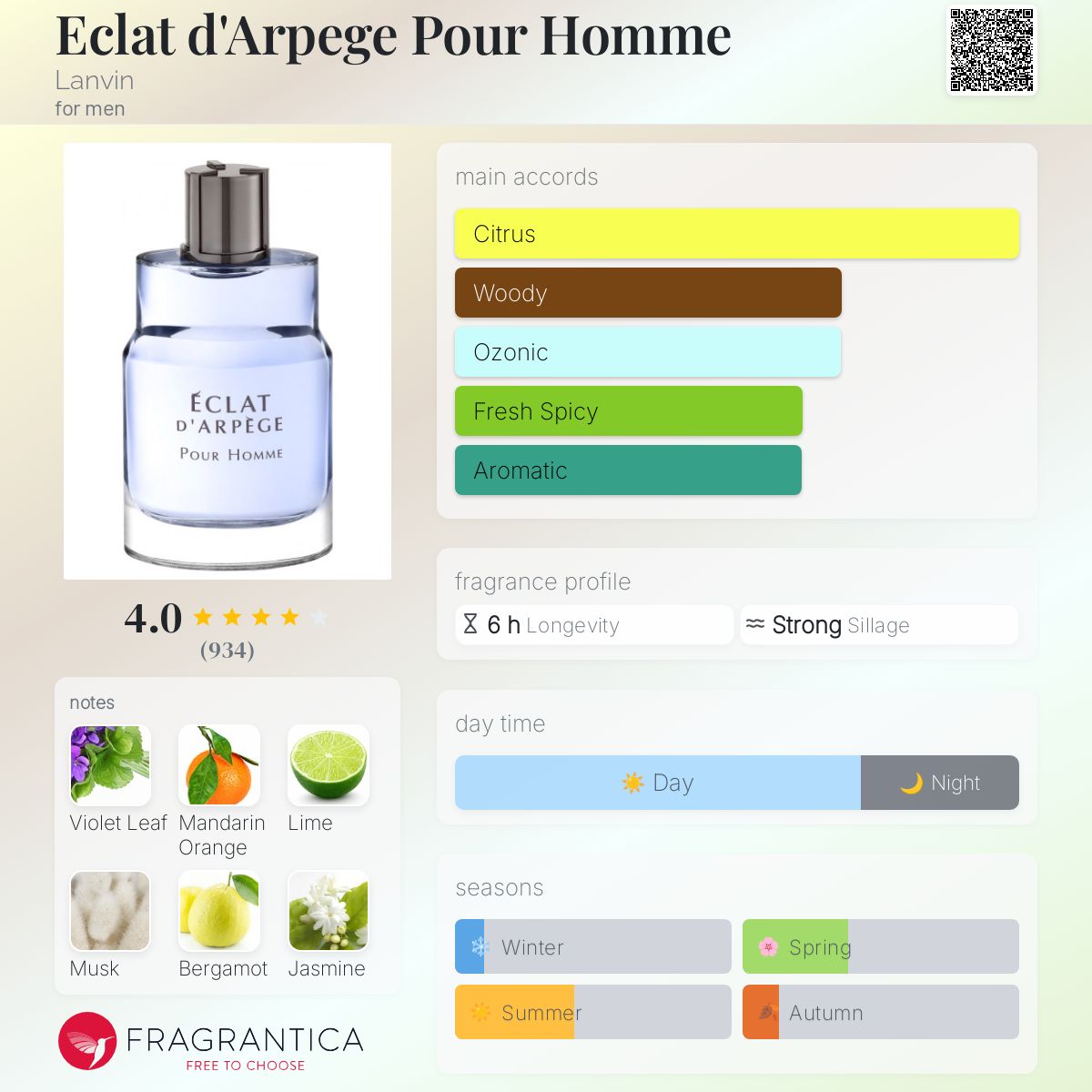 Eclat d'Arpege Pour Homme by Lanvin is a Citrus Aromatic fragrance for men. Eclat d'Arpege Pour Homme was launched in 2015. The nose behind this fragrance is Sonia Constant. Top notes are Mandarin Orange, Lime, and Bergamot; middle notes are Violet Leaf, Jasmine, and Rosemary; base notes are Musk, Cedar, and Sandalwood. (Fragrantica.com)