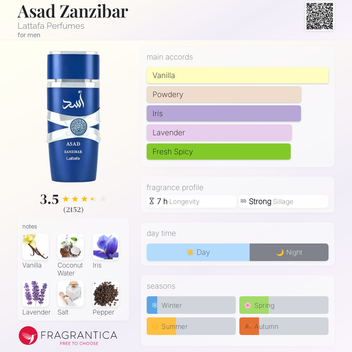 Asad Zanzibar by Lattafa Perfumes is a fragrance for men. This is a new fragrance. Asad Zanzibar was launched in 2024. The nose behind this fragrance is Fanny Bal. Top notes are Lavender and Black Pepper; middle notes are Coconut Water, Iris and Salt; base notes are Vanilla and Incense. (Fragrantica.com)