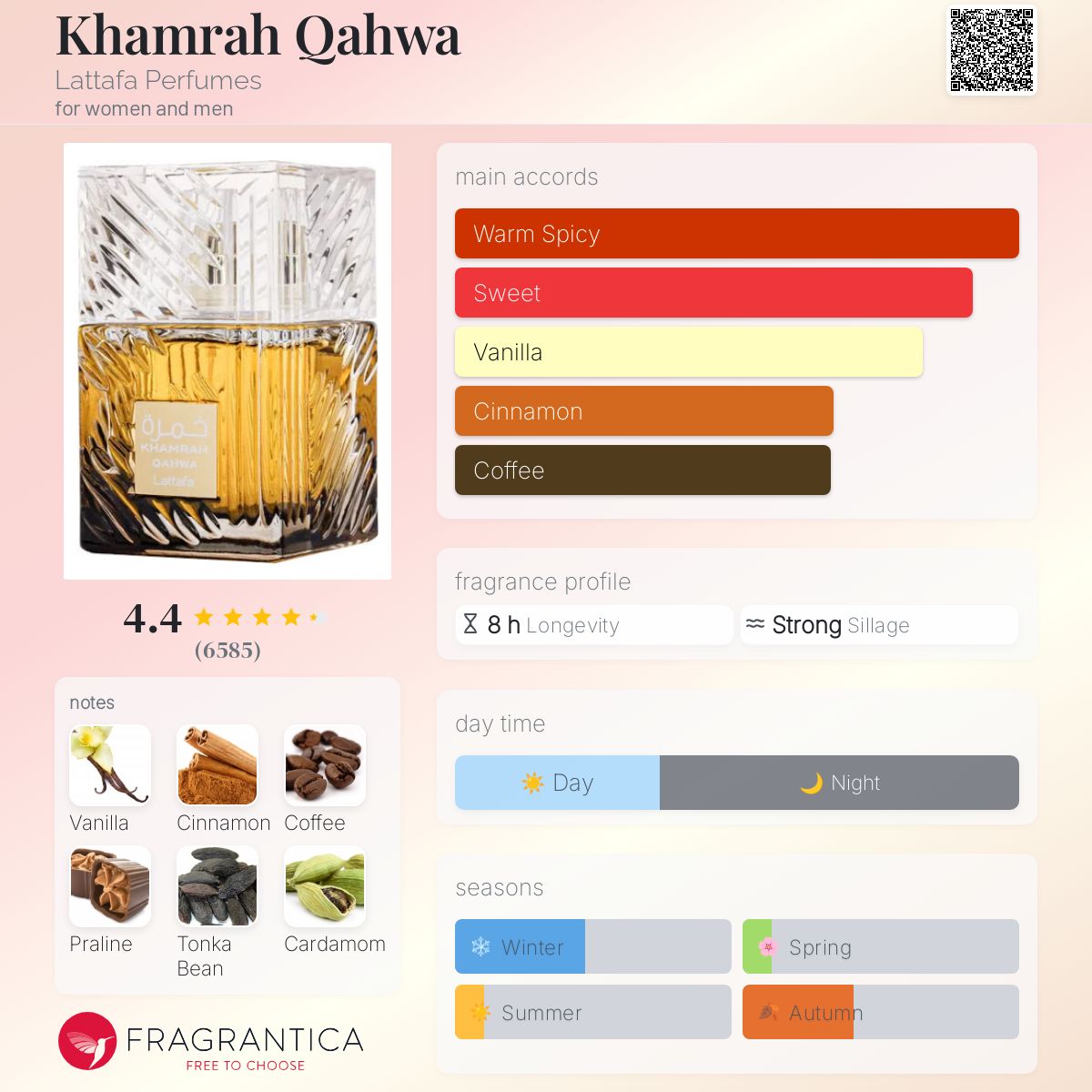 Khamrah Qahwa by Lattafa Perfumes is an Oriental Vanilla fragrance for women and men. This is a new fragrance. Khamrah Qahwa was launched in 2023. Top notes are Cinnamon, Cardamom, and Ginger; middle notes are Praline, Candied Fruits, and White Flowers; base notes are Vanilla, Coffee, Tonka Bean, Benzoin, and Musk. (Fragrantica.com)