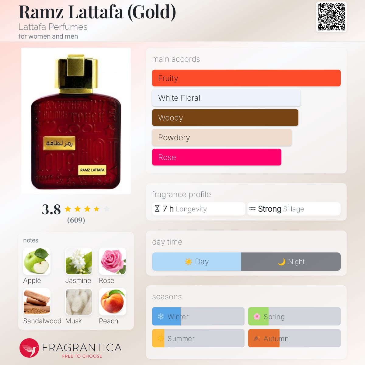Ramz Lattafa Gold by Lattafa Perfumes is a fragrance for women and men. Top notes are Apple, Peach, Pear, Black Currant and Sweet Orange; middle notes are Jasmine Sambac, Rose and Orange Blossom; base notes are Sandalwood, White Musk, Vanilla and Patchouli. (Fragrantica.com)