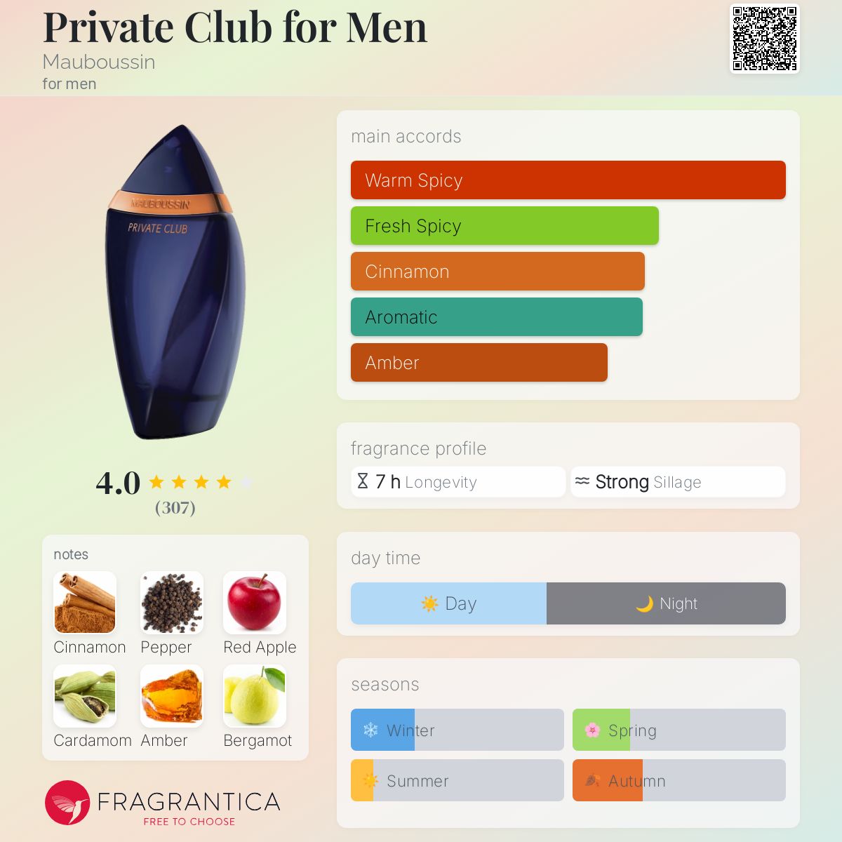 Private Club for Men by Mauboussin is an Oriental Woody fragrance for men. Private Club for Men was launched in 2018. The nose behind this fragrance is Alexandra Carlin. Top notes are Pepper, Cardamom, Bergamot, and Coriander; middle notes are Cinnamon and Red Apple; base notes are Amber and Patchouli. (Fragrantica.com)