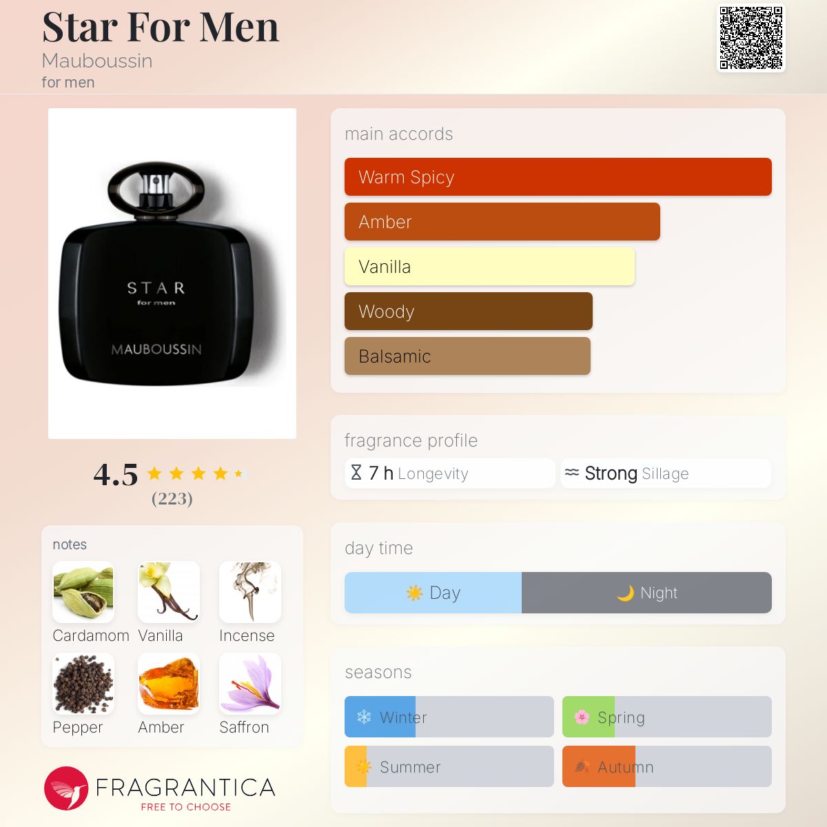 Star For Men by Mauboussin is an Oriental Woody fragrance for men. This is a new fragrance. Star For Men was launched in 2024. Top notes are Cardamom and Black Pepper; middle notes are Incense and Saffron; base notes are Vanilla, White Amber, Patchouli, Iris, and Cedar. (Fragrantica.com)