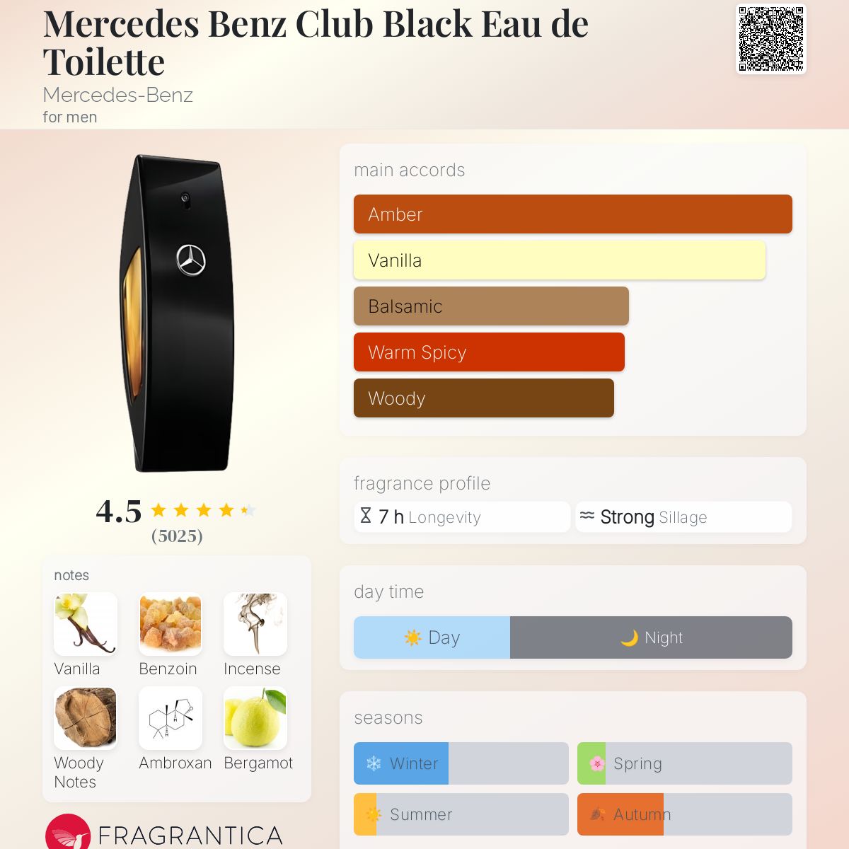 Mercedes Benz Club Black Eau de Toilette by Mercedes-Benz is a Oriental fragrance for men. Mercedes Benz Club Black Eau de Toilette was launched in 2017. The nose behind this fragrance is Olivier Cresp. Top note is Bergamot; middle notes are Incense and Jasmine; base notes are Vanilla, Benzoin, Woodsy Notes and Ambroxan. (Fragrantica.com)