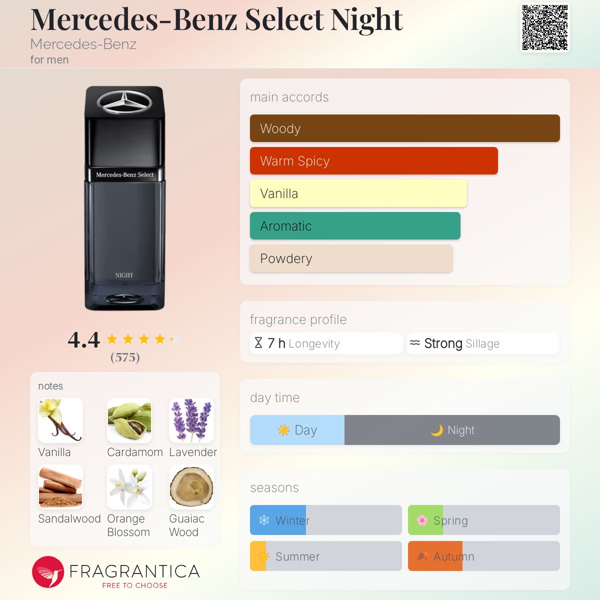 Mercedes-Benz Select Night by Mercedes-Benz is an Oriental Spicy fragrance for men. Mercedes-Benz Select Night was launched in 2019. The nose behind this fragrance is Olivier Cresp. Top notes are Cardamom, Lavender and Bergamot; middle notes are Orange Blossom, Guaiac Wood and Cedar; base notes are Vanilla, Sandalwood and Patchouli. (Fragrantica.com)