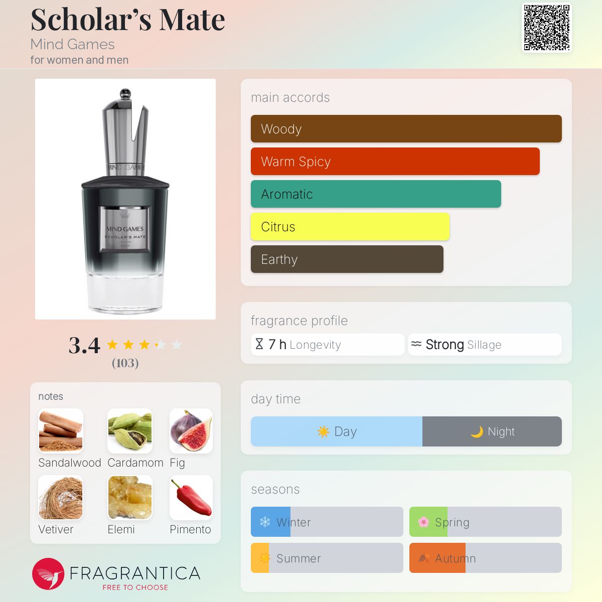 Scholar’s Mate by Mind Games is a fragrance for women and men. This is a new fragrance. Scholar’s Mate was launched in 2022. The nose behind this fragrance is Christelle Laprade. Top notes are Cardamom, Grapefruit, Bergamot and Cinnamon Leaf; middle notes are elemi, Pimento and Orris; base notes are Sandalwood, Fig Nectar, Madagascar Vetiver and Cypriol Oil or Nagarmotha. (Fragrantica.com)