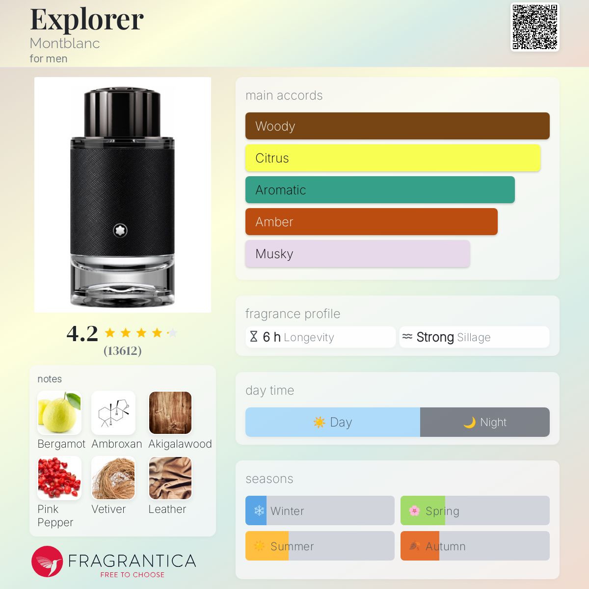 Explorer by Montblanc is a Woody Aromatic fragrance for men. Explorer was launched in 2019. Explorer was created by Jórdi Fernandez, Antoine Maisondieu, and Olivier Pescheux. Top notes are Bergamot, Pink Pepper, and Clary Sage; middle notes are Haitian Vetiver and Leather; base notes are Ambroxan, Akigalawood, Indonesian Patchouli Leaf, and Cacao Pod. (Fragrantica.com)