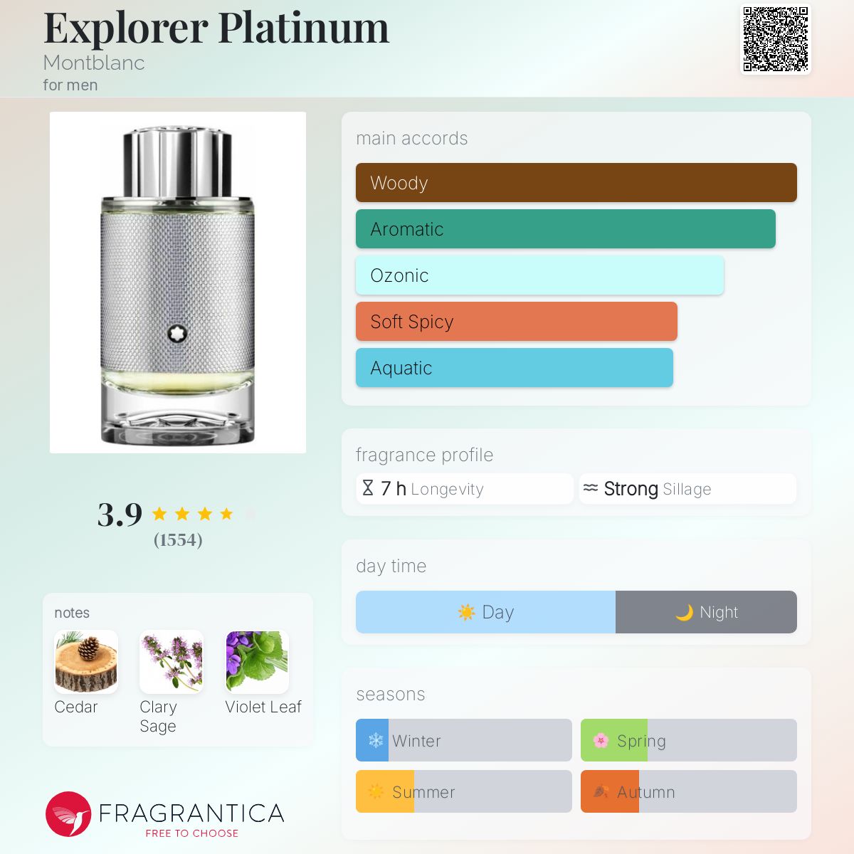 Explorer Platinum by Montblanc is a Woody Aromatic fragrance for men. This is a new fragrance. Explorer Platinum was launched in 2023. The nose behind this fragrance is Bruno Jovanovic. Top note is Violet Leaves; middle note is Clary Sage; base note is Cedarwood. (Fragrantica.com)