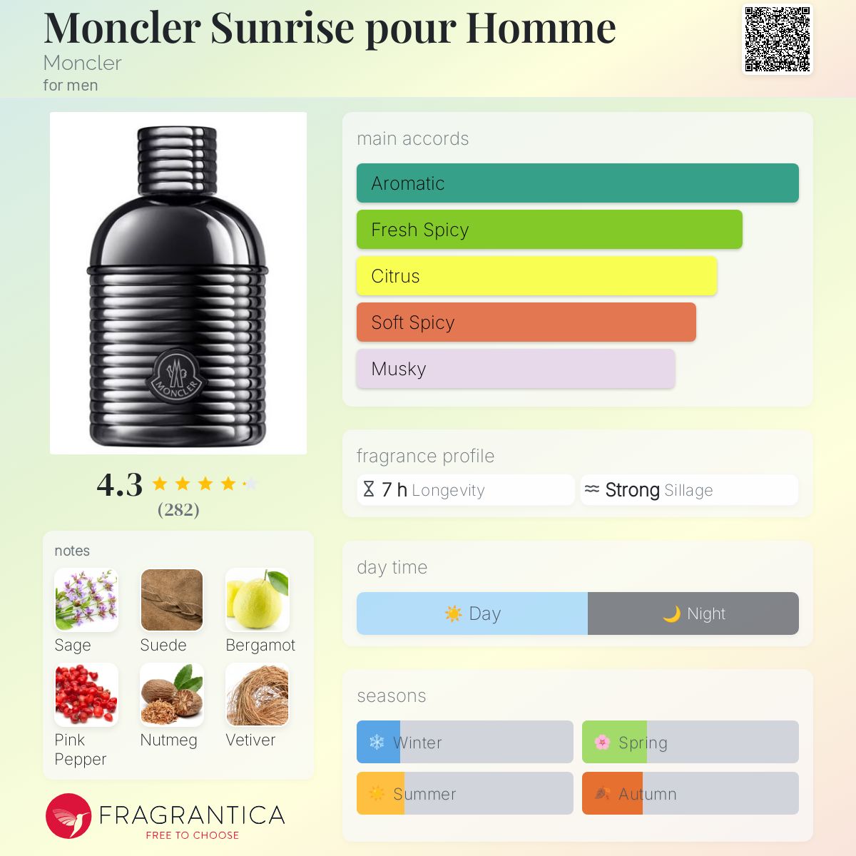 Moncler Sunrise pour Homme by Moncler is a fragrance for men. This is a new fragrance. Moncler Sunrise pour Homme was launched in 2023. Moncler Sunrise pour Homme was created by Antoine Maisondieu and Jordi Fernández. Top notes are Bergamot, Pink Pepper, and Lemon; middle notes are Sage, Suede, and Indonesian Nutmeg; base notes are Haitian Vetiver, Frankincense, and Patchouli. (Fragrantica.com)