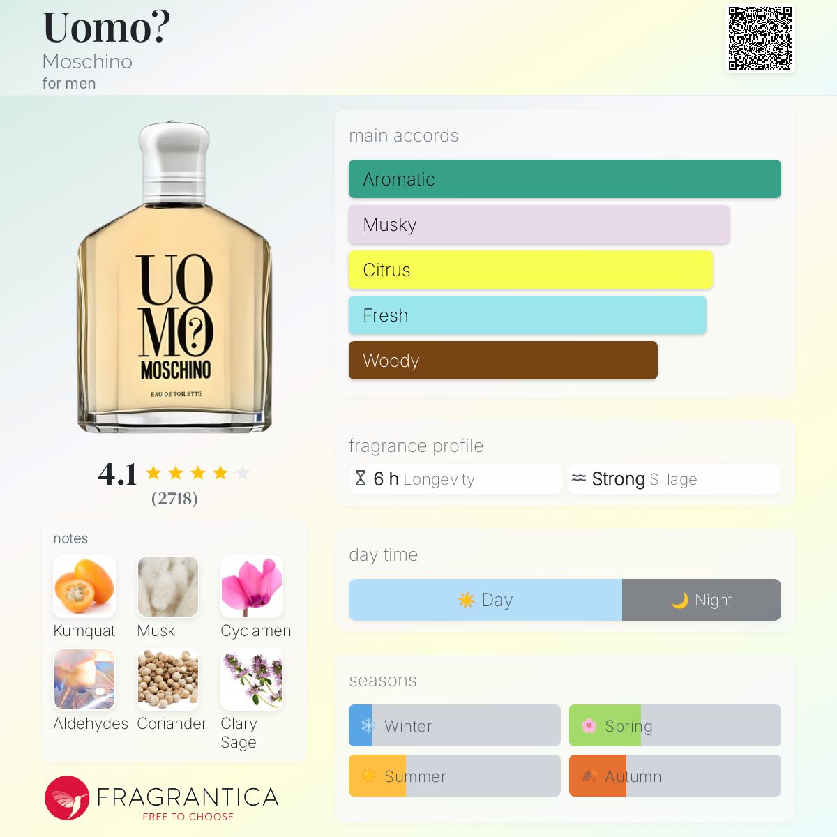 Uomo? by Moschino is a Woody Floral Musk fragrance for men. Uomo? was launched in 1998. The nose behind this fragrance is Olivier Cresp. Top notes are Kumquat, Aldehydes, Coriander and Brazilian Rosewood; middle notes are Cyclamen, Clary Sage, Cinnamon and Labdanum; base notes are Musk, Ambergris, Cedar and Wormwood. (Fragrantica.com)