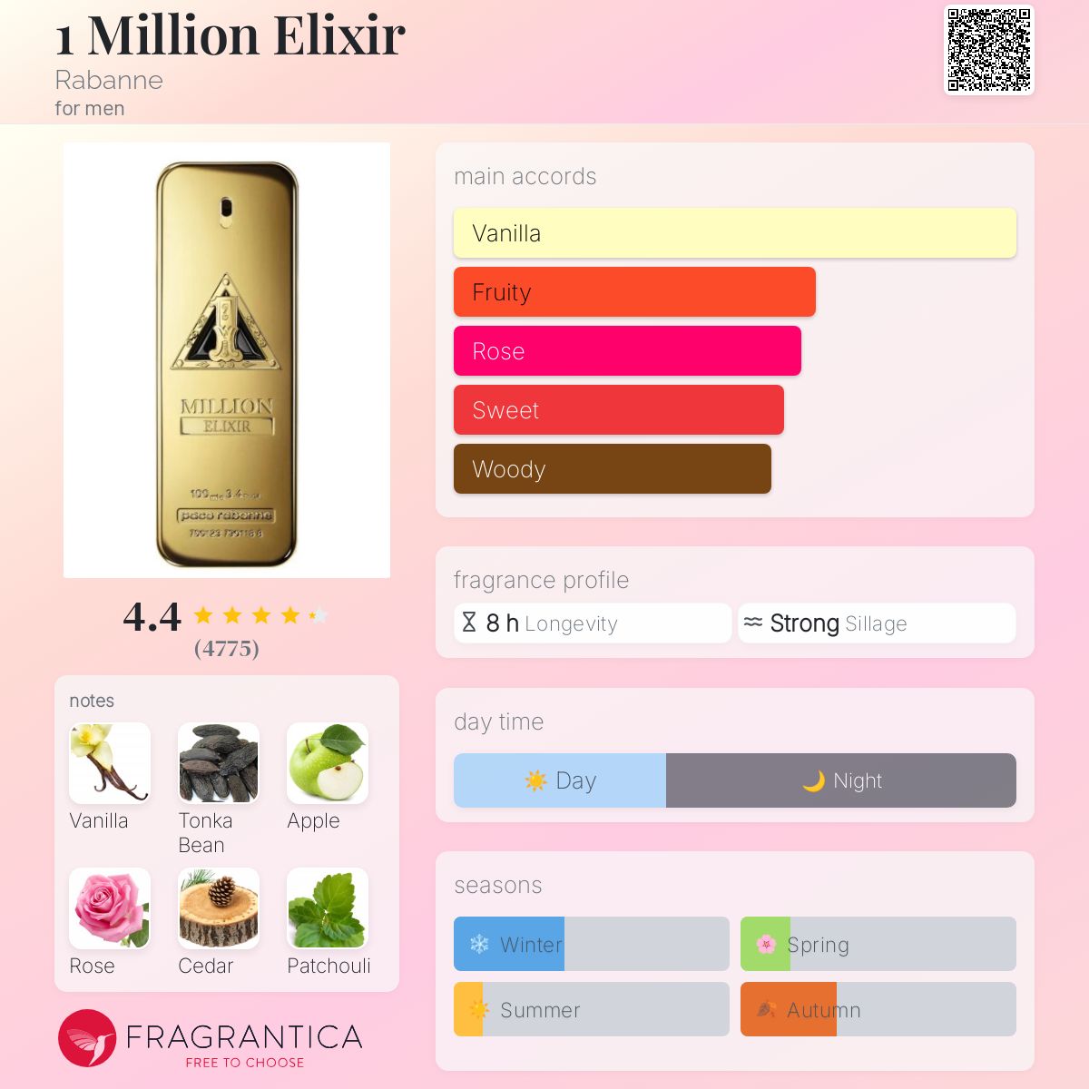 1 Million Elixir by Rabanne is a Woody Aromatic fragrance for men. This is a new fragrance. 1 Million Elixir was launched in 2022. Top notes are Apple and Davana; middle notes are Damask Rose, Cedar, and Osmanthus; base notes are Vanilla Absolute, Tonka Bean, and Patchouli. (Fragrantica.com)