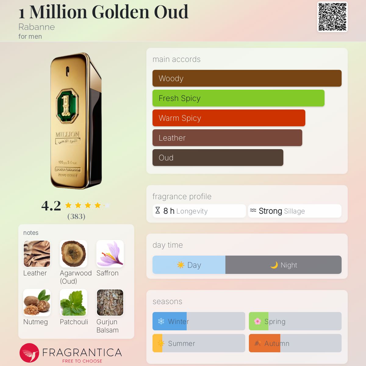 1 Million Golden Oud by Rabanne is a Leather fragrance for men. This is a new fragrance. 1 Million Golden Oud was launched in 2023. The nose behind this fragrance is Christophe Raynaud. Top notes are Saffron, Nutmeg, Black Pepper and Bergamot; middle notes are Patchouli, Gurjan balsam and Sandalwood; base notes are Leather, Oud, Cedarwood and Labdanum. (Fragrantica.com)