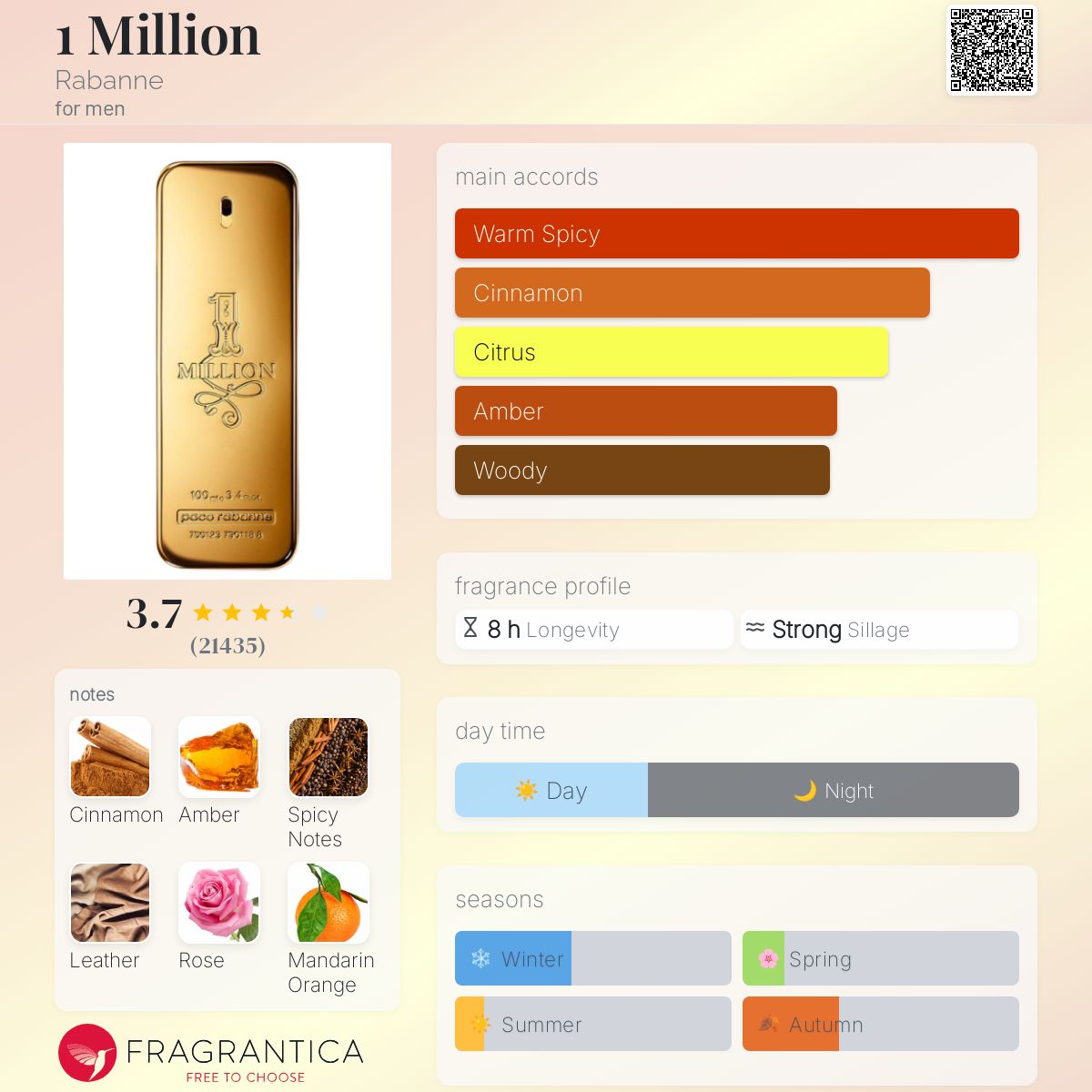 1 Million by Rabanne is a Woody Spicy fragrance for men. 1 Million was launched in 2008. 1 Million was created by Christophe Raynaud, Olivier Pescheux, Michel Girard, and Christian Dussoulier. Top notes are Blood Mandarin, Grapefruit, and Mint; middle notes are Cinnamon, Spicy Notes, and Rose; base notes are Amber, Leather, Woody Notes, and Indian Patchouli. (Fragrantica.com)