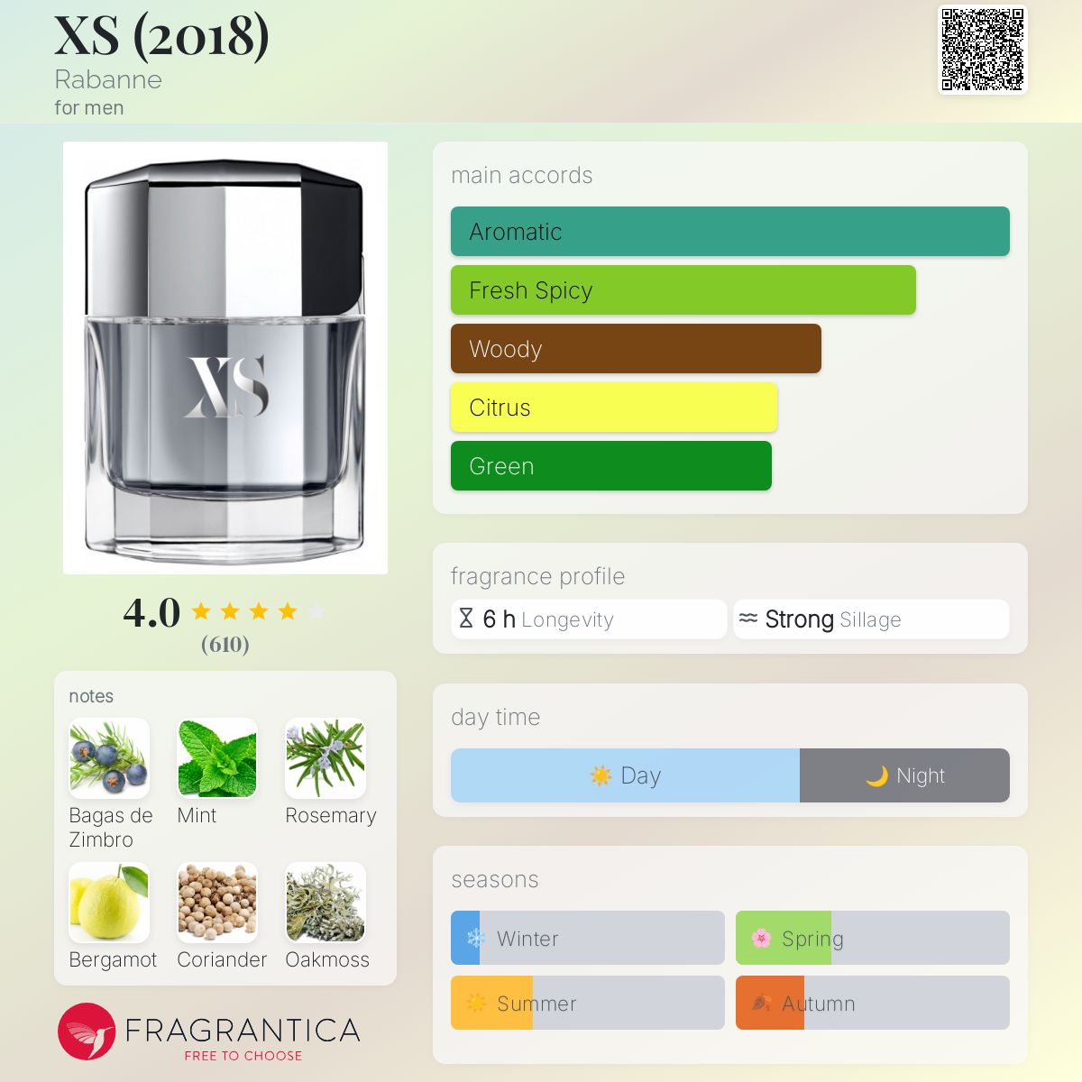 XS (2018) by Rabanne is a Woody Aromatic fragrance for men. XS (2018) was launched in 2018. XS (2018) was created by Rosendo Mateu and Gerard Anthony. Top notes are Mint, Bergamot, and Lemon; middle notes are Juniper Berries, Coriander, and Geranium; base notes are Rosemary, Oakmoss, and Sandalwood. (Fragrantica.com)