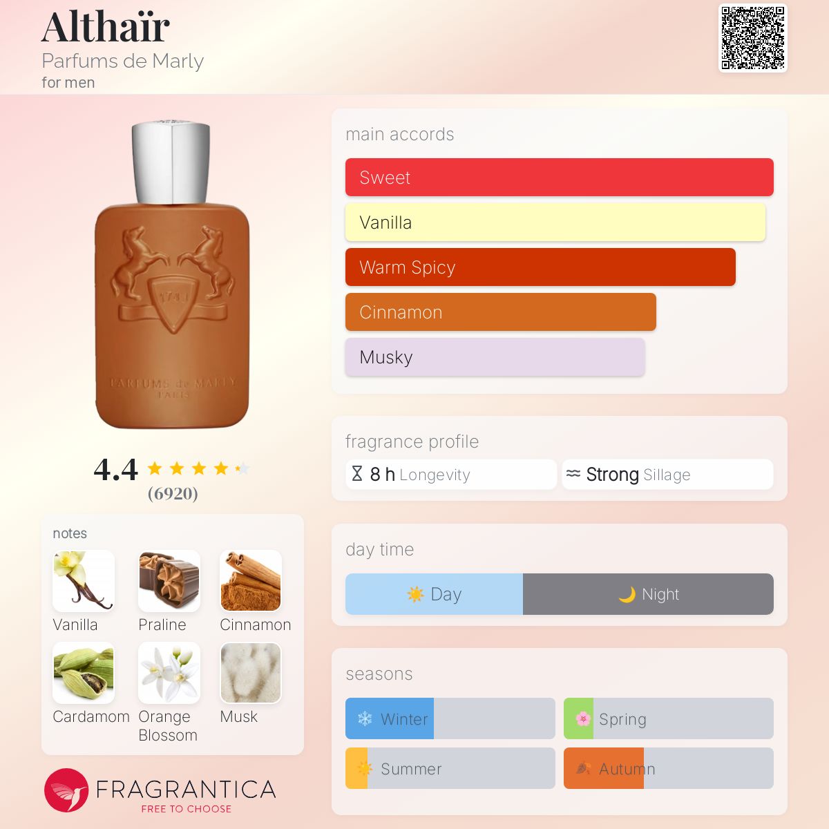 Althaïr by Parfums de Marly is a Oriental Vanilla fragrance for men. This is a new fragrance. Althaïr was launched in 2023. Althaïr was created by Hamid Merati-Kashani and Ilias Ermenidis. Top notes are Cinnamon, Cardamom, Orange Blossom and Bergamot; middle notes are Bourbon Vanilla and elemi; base notes are Praline, Musk, Ambroxan, Guaiac Wood, Tonka and Candied Almond. (Fragrantica.com)