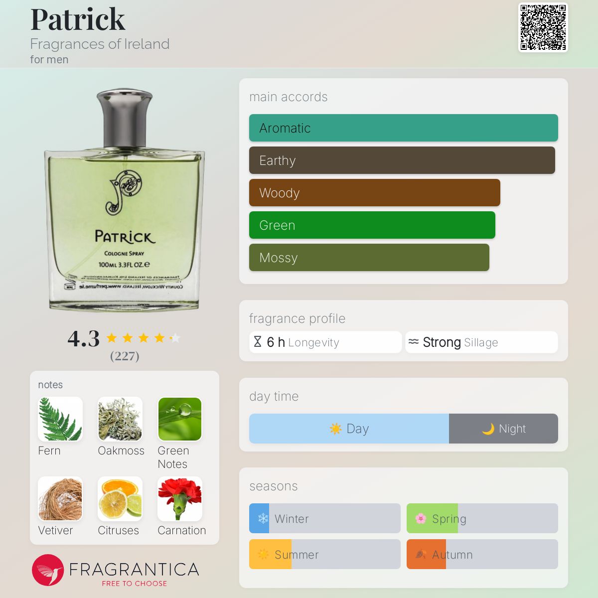 Patrick by Fragrances of Ireland is an Oriental Fougere fragrance for men. Patrick was launched in 1999. Top notes are Fern, Green Notes, Citruses, and Spicy Notes; middle notes are Carnation and Rose; base notes are Oakmoss, Vetiver, Musk,, and Patchouli. (Fragrantica.com)