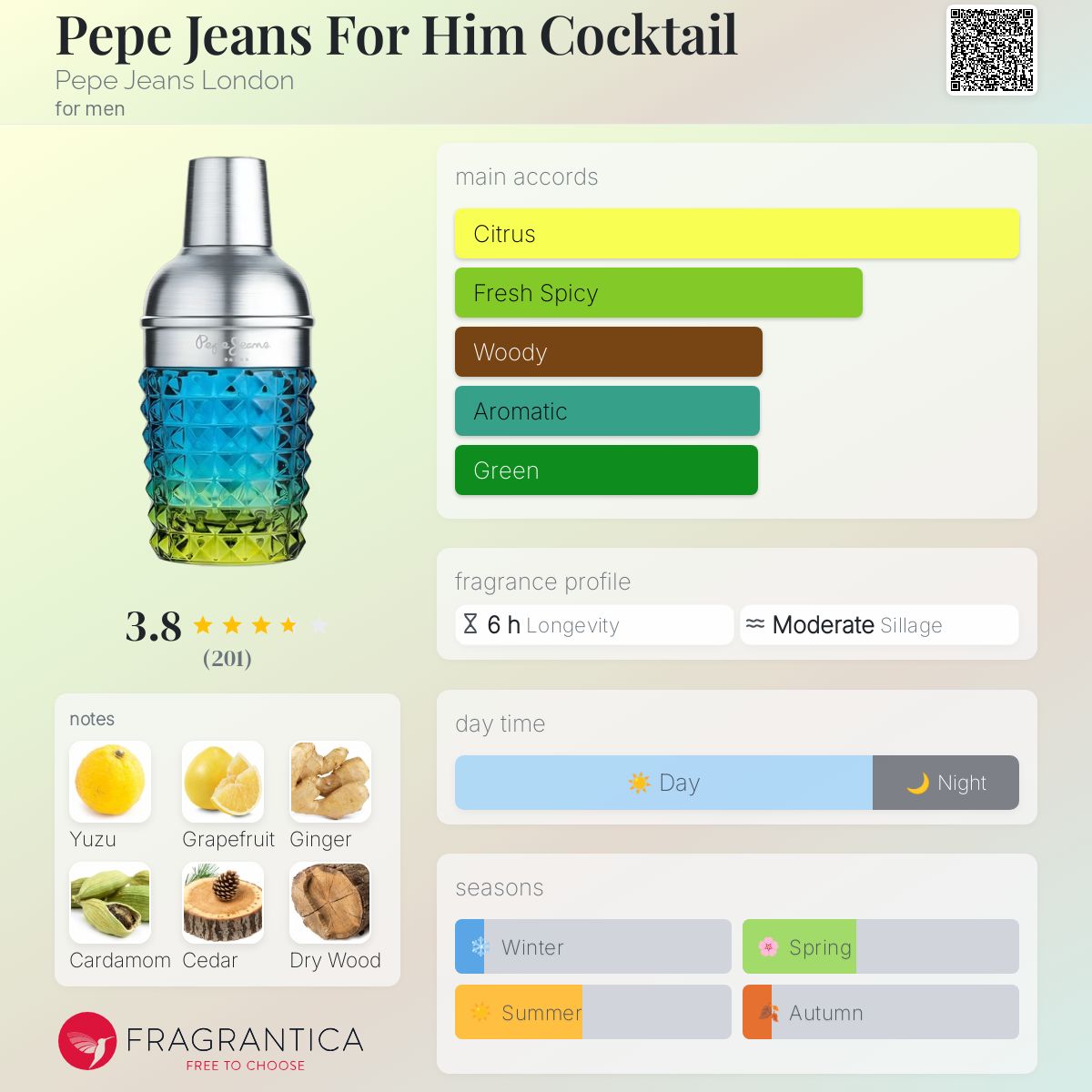Pepe Jeans For Him Cocktail by Pepe Jeans London is a Woody Spicy fragrance for men. Pepe Jeans For Him Cocktail was launched in 2019. The nose behind this fragrance is Jérôme di Marino. Top notes are Yuzu, Grapefruit and Violet Leaf; middle notes are Ginger, Cardamom and Thyme; base notes are Cedar, Dry Wood and Moss. (Fragrantica.com)