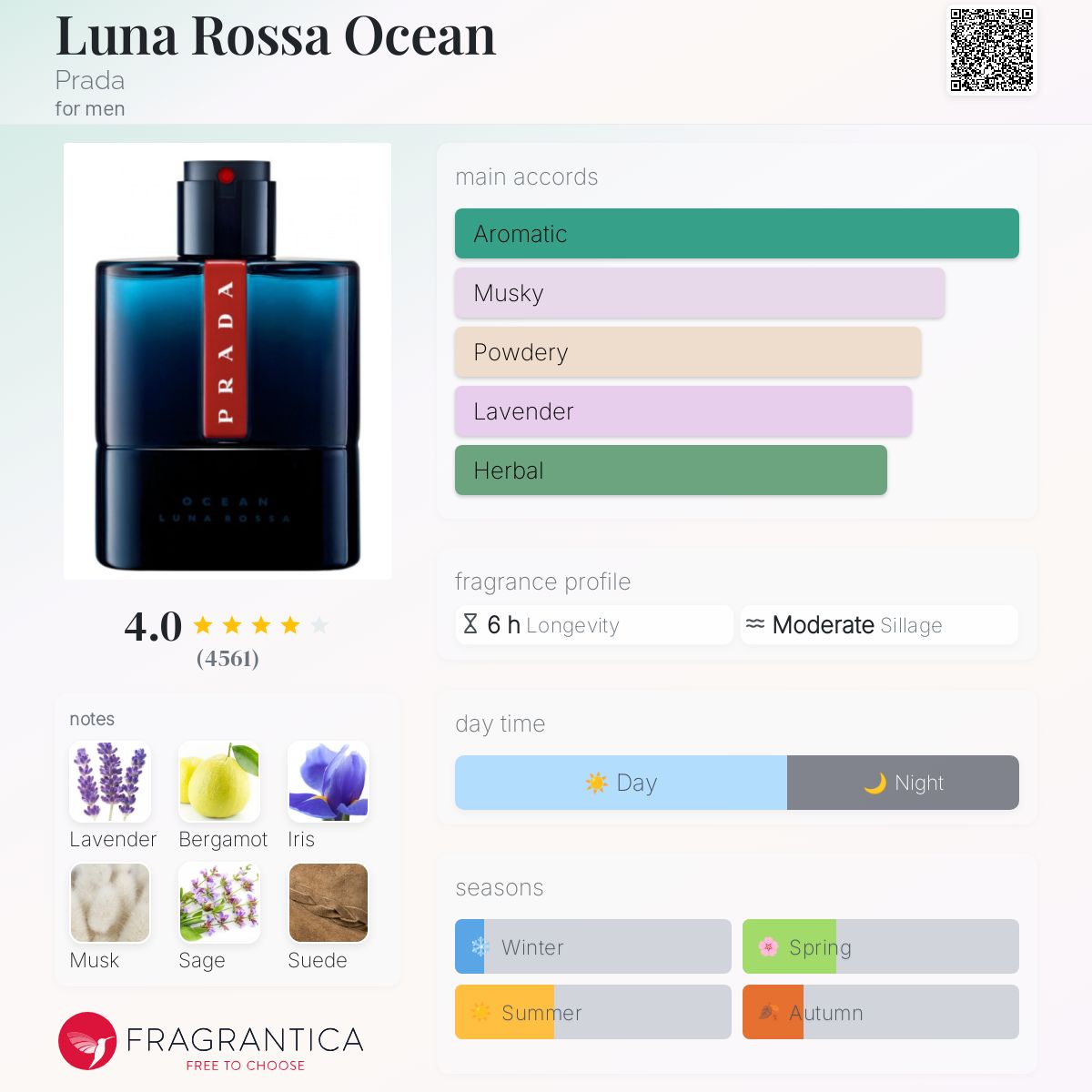 Luna Rossa Ocean Eau de Parfum by Prada is a Oriental Woody fragrance for men. This is a new fragrance. Luna Rossa Ocean Eau de Parfum was launched in 2023. Top note is Grapefruit; middle notes are Woody Notes and Frankincense; base notes are Vanilla and Amber Xtreme. (Fragrantica.com)