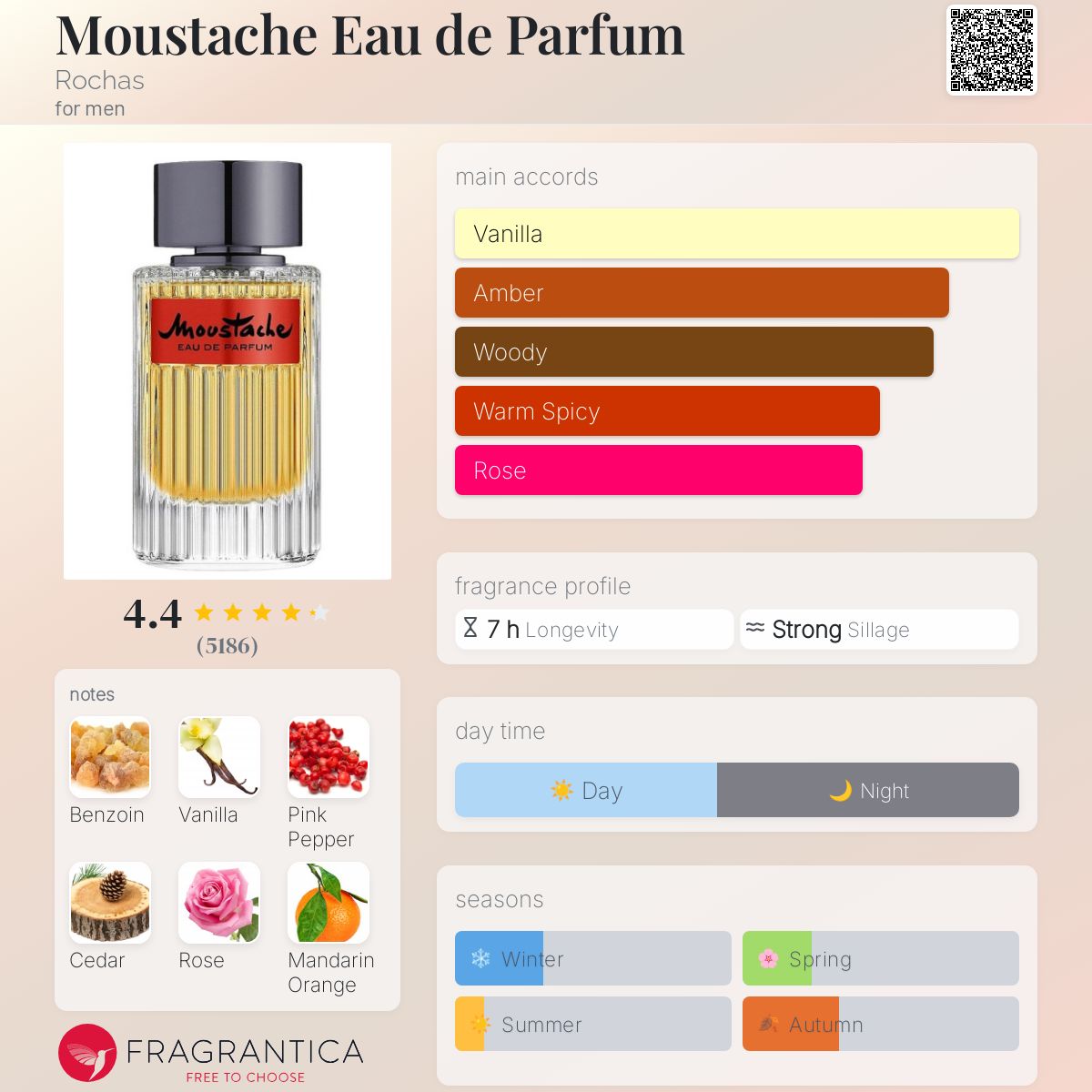 Moustache Eau de Parfum by Rochas is an Oriental Woody fragrance for men. Moustache Eau de Parfum was launched in 2018. The nose behind this fragrance is Natalie Gracia-Cetto. Top notes are Pink Pepper and Mandarin Orange; middle notes are Atlas Cedar and Bulgarian Rose; base notes are Benzoin, Vanilla, and Patchouli. (Fragrantica.com)